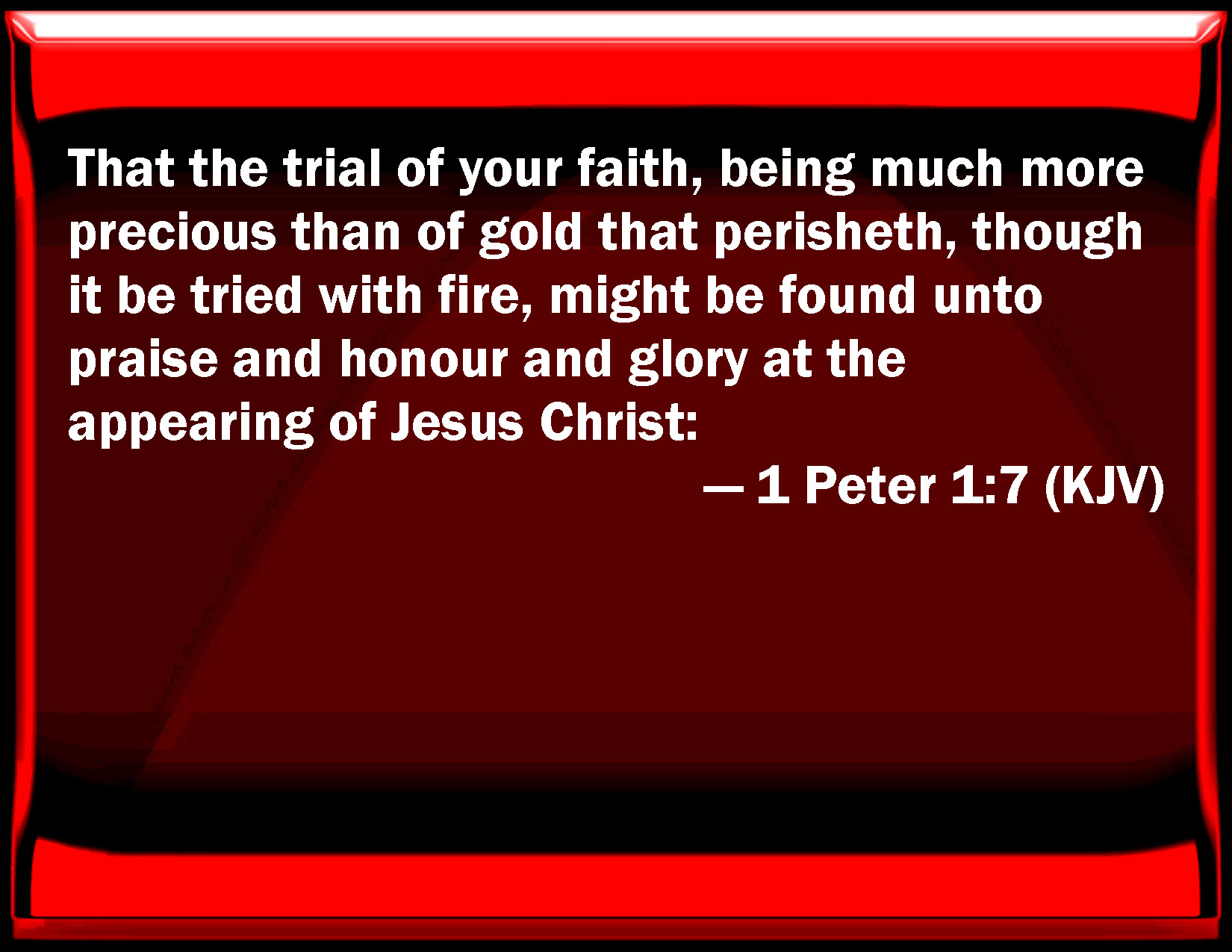 Bible Verse Slide 1 Peter 1:7 That the trial of your faith, being much more precious than of gold that perishes, though it be tried with fire, might be found to praise and honor and glory at the appearing of Jesus Christ: KJV: That the trial of your faith, being much more precious than of gold that perisheth, though it be tried with fire, might be found unto praise and honour and glory at the appearing of Jesus Christ: DRB: That the trial of your faith (much more precious than gold which is tried by the fire) may be found unto praise and glory and honour at the appearing of Jesus Christ: DBT: that the proving of your faith, much more precious than of gold which perishes, though it be proved by fire, be found to praise and glory and honour in the revelation of Jesus Christ: ERV: that the proof of your faith, being more precious than gold that perisheth though it is proved by fire, might be found unto praise and glory and honour at the revelation of Jesus Christ: WBT: That the trial of your faith, being much more precious than of gold that perisheth, though tried with fire, might be found to praise, and honor, and glory, at the appearing of Jesus Christ: WEB: that the proof of your faith, which is more precious than gold that perishes even though it is tested by fire, may be found to result in praise, glory, and honor at the revelation of Jesus Christ— YLT: that the proof of your faith — much more precious than of gold that is perishing, and through fire being approved — may be found to praise, and honour, and glory, in the revelation of Jesus Christ,Links 1 Peter 1:7 NIV • 1 Peter 1:7 NLT • 1 Peter 1:7 ESV • 1 Peter 1:7 NASB • 1 Peter 1:7 KJV • 1 Peter 1:7 Interlinear • 1 Peter 1:7 Commentaries • 1 Peter 1:7 Parallel Texts • 1 Peter 1:7 Bible Apps • 1 Peter 1:7 Parallel • Bible Hub |