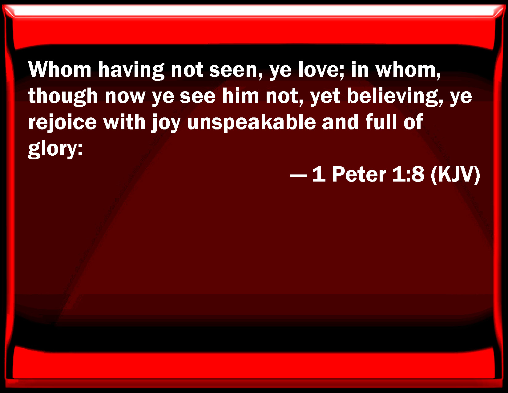 Bible Verse Slide 1 Peter 1:8 Whom having not seen, you love; in whom, though now you see him not, yet believing, you rejoice with joy unspeakable and full of glory: KJV: Whom having not seen, ye love; in whom, though now ye see him not, yet believing, ye rejoice with joy unspeakable and full of glory: DRB: Whom having not seen, you love: in whom also now, though you see him not, you believe: and believing shall rejoice with joy unspeakable and glorified; DBT: whom, having not seen, ye love; on whom though not now looking, but believing, ye exult with joy unspeakable and filled with the glory, ERV: whom not having seen ye love; on whom, though now ye see him not, yet believing, ye rejoice greatly with joy unspeakable and full of glory: WBT: Whom having not seen, ye love; in whom, though now ye see him not, yet believing, ye rejoice with joy unspeakable, and full of glory: WEB: whom not having known you love; in whom, though now you don't see him, yet believing, you rejoice greatly with joy unspeakable and full of glory— YLT: whom, not having seen, ye love, in whom, now not seeing and believing, ye are glad with joy unspeakable and glorified,Links 1 Peter 1:8 NIV • 1 Peter 1:8 NLT • 1 Peter 1:8 ESV • 1 Peter 1:8 NASB • 1 Peter 1:8 KJV • 1 Peter 1:8 Interlinear • 1 Peter 1:8 Commentaries • 1 Peter 1:8 Parallel Texts • 1 Peter 1:8 Bible Apps • 1 Peter 1:8 Parallel • Bible Hub |