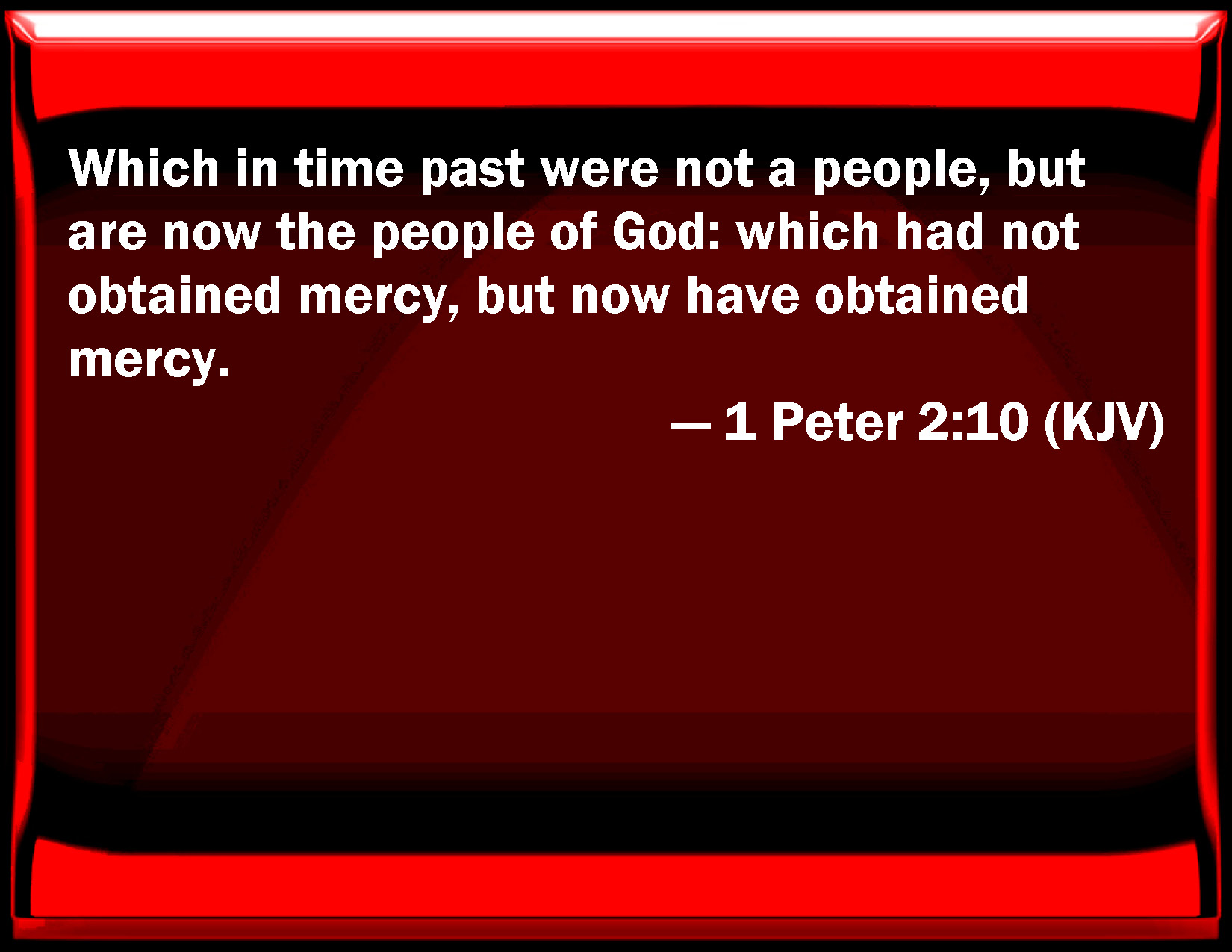 Bible Verse Slide 1 Peter 2:10 Which in time past were not a people, but are now the people of God: which had not obtained mercy, but now have obtained mercy. KJV: Which in time past were not a people, but are now the people of God: which had not obtained mercy, but now have obtained mercy. DRB: Who in time past were not a people: but are now the people of God. Who had not obtained mercy; but now have obtained mercy. DBT: who once were not a people, but now God's people; who were not enjoying mercy, but now have found mercy. ERV: which in time past were no people, but now are the people of God: which had not obtained mercy, but now have obtained mercy. WBT: Who in time past were not a people, but are now the people of God: who had not obtained mercy, but now have obtained mercy. WEB: who in time past were no people, but now are God's people, who had not obtained mercy, but now have obtained mercy. YLT: who were once not a people, and are now the people of God; who had not found kindness, and now have found kindness.Links 1 Peter 2:10 NIV • 1 Peter 2:10 NLT • 1 Peter 2:10 ESV • 1 Peter 2:10 NASB • 1 Peter 2:10 KJV • 1 Peter 2:10 Interlinear • 1 Peter 2:10 Commentaries • 1 Peter 2:10 Parallel Texts • 1 Peter 2:10 Bible Apps • 1 Peter 2:10 Parallel • Bible Hub |
