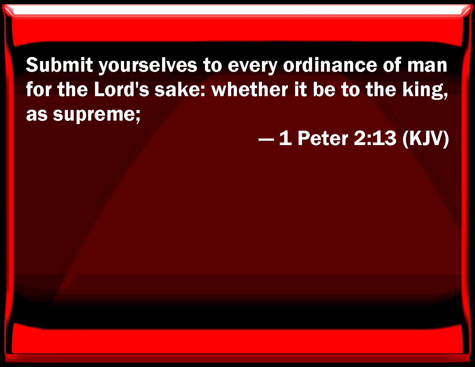 Bible Verse Slide 1 Peter 2:13 Submit yourselves to every ordinance of man for the Lord's sake: whether it be to the king, as supreme; KJV: Submit yourselves to every ordinance of man for the Lord's sake: whether it be to the king, as supreme; DRB: Be ye subject therefore to every human creature for God's sake: whether it be to the king as excelling; DBT: Be in subjection therefore to every human institution for the Lord's sake; whether to the king as supreme, ERV: Be subject to every ordinance of man for the Lord's sake: whether it be to the king, as supreme; WBT: Submit yourselves to every ordinance of man for the Lord's sake: whether to the king, as supreme; WEB: Therefore subject yourselves to every ordinance of man for the Lord's sake: whether to the king, as supreme; YLT: Be subject, then, to every human creation, because of the Lord, whether to a king, as the highest,Links 1 Peter 2:13 NIV • 1 Peter 2:13 NLT • 1 Peter 2:13 ESV • 1 Peter 2:13 NASB • 1 Peter 2:13 KJV • 1 Peter 2:13 Interlinear • 1 Peter 2:13 Commentaries • 1 Peter 2:13 Parallel Texts • 1 Peter 2:13 Bible Apps • 1 Peter 2:13 Parallel • Bible Hub |