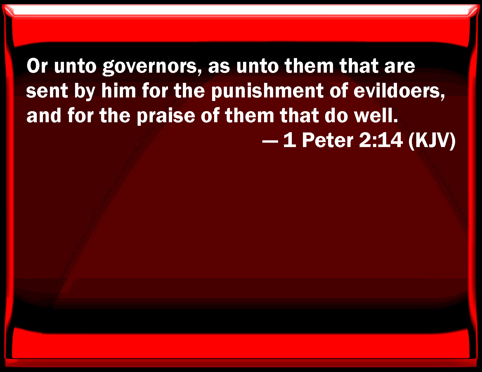Bible Verse Slide 1 Peter 2:14 Or to governors, as to them that are sent by him for the punishment of evildoers, and for the praise of them that do well. KJV: Or unto governors, as unto them that are sent by him for the punishment of evildoers, and for the praise of them that do well. DRB: Or to governors as sent by him for the punishment of evildoers, and for the praise of the good: DBT: or to rulers as sent by him, for vengeance on evildoers, and praise to them that do well. ERV: or unto governors, as sent by him for vengeance on evil-doers and for praise to them that do well. WBT: Or to governors, as to them that are sent by him for the punishment of evil-doers, and for the praise of them that do well. WEB: or to governors, as sent by him for vengeance on evildoers and for praise to those who do well. YLT: whether to governors, as to those sent through him, for punishment, indeed, of evil-doers, and a praise of those doing good;Links 1 Peter 2:14 NIV • 1 Peter 2:14 NLT • 1 Peter 2:14 ESV • 1 Peter 2:14 NASB • 1 Peter 2:14 KJV • 1 Peter 2:14 Interlinear • 1 Peter 2:14 Commentaries • 1 Peter 2:14 Parallel Texts • 1 Peter 2:14 Bible Apps • 1 Peter 2:14 Parallel • Bible Hub |