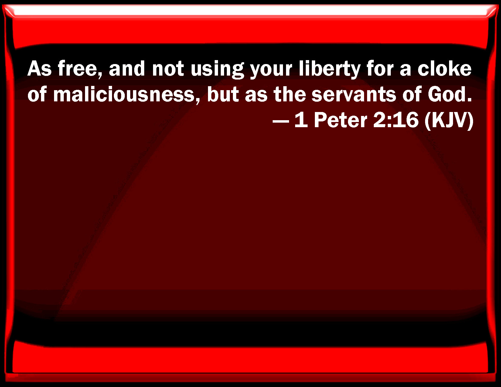 Bible Verse Slide 1 Peter 2:16 As free, and not using your liberty for a cloak of maliciousness, but as the servants of God. KJV: As free, and not using your liberty for a cloke of maliciousness, but as the servants of God. DRB: As free, and not as making liberty a cloak for malice, but as the servants of God. DBT: as free, and not as having liberty as a cloak of malice, but as God's bondmen. ERV: as free, and not using your freedom for a cloke of wickedness, but as bondservants of God. WBT: As free, and not using your liberty for a cloke of maliciousness, but as the servants of God. WEB: as free, and not using your freedom for a cloak of wickedness, but as bondservants of God. YLT: as free, and not having the freedom as the cloak of the evil, but as servants of God;Links 1 Peter 2:16 NIV • 1 Peter 2:16 NLT • 1 Peter 2:16 ESV • 1 Peter 2:16 NASB • 1 Peter 2:16 KJV • 1 Peter 2:16 Interlinear • 1 Peter 2:16 Commentaries • 1 Peter 2:16 Parallel Texts • 1 Peter 2:16 Bible Apps • 1 Peter 2:16 Parallel • Bible Hub |