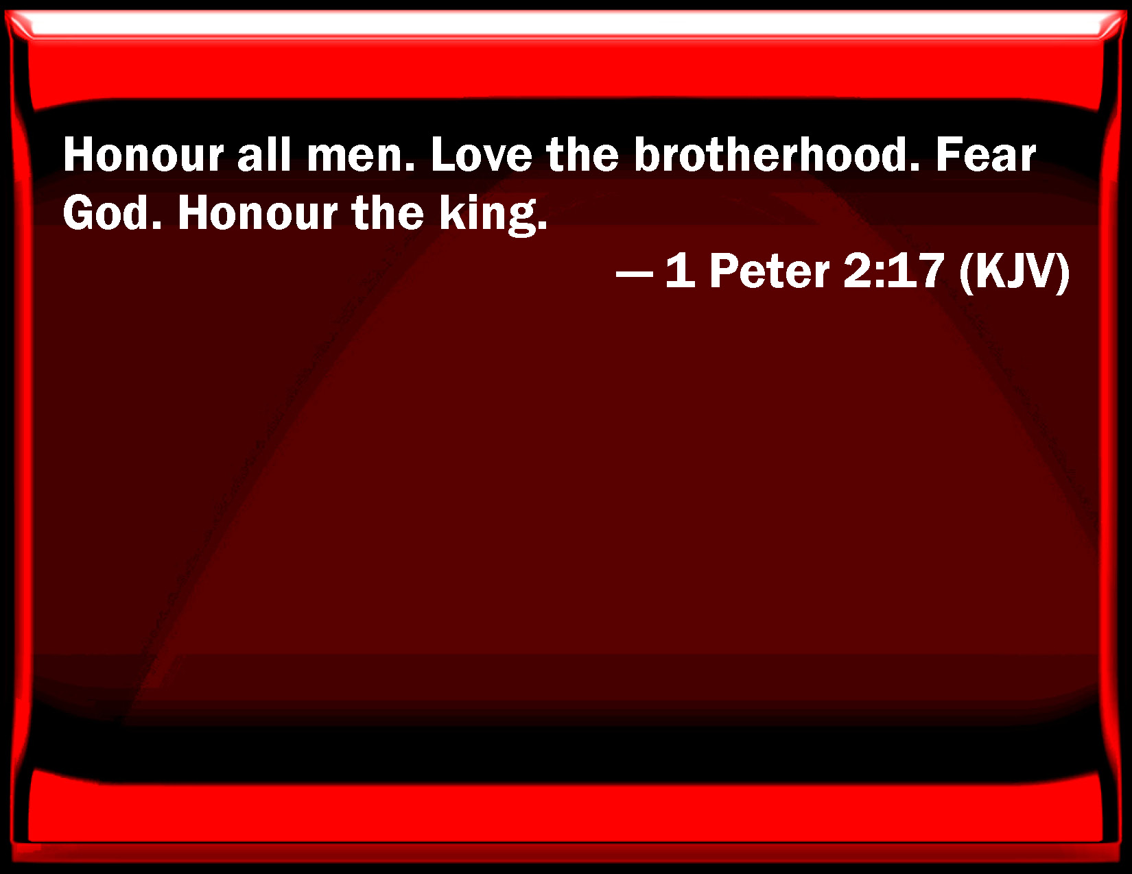 1 Peter 2:17 Honor all men. Love the brotherhood. Fear God. Honor the king.
