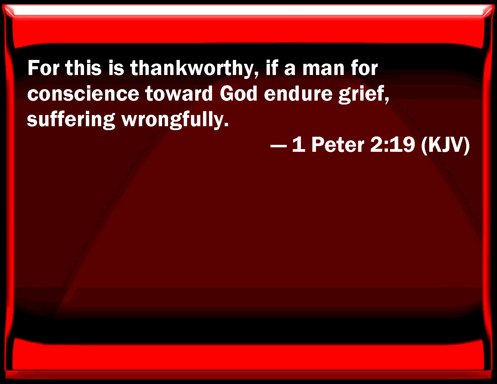 Bible Verse Slide 1 Peter 2:19 For this is thank worthy, if a man for conscience toward God endure grief, suffering wrongfully. KJV: For this is thankworthy, if a man for conscience toward God endure grief, suffering wrongfully. DRB: For this is thankworthy, if for conscience towards God, a man endure sorrows, suffering wrongfully. DBT: For this is acceptable, if one, for conscience sake towards God, endure griefs, suffering unjustly. ERV: For this is acceptable, if for conscience toward God a man endureth griefs, suffering wrongfully. WBT: For this is thank-worthy, if a man for conscience towards God endureth grief, suffering wrongfully. WEB: For it is commendable if someone endures pain, suffering unjustly, because of conscience toward God. YLT: for this is gracious, if because of conscience toward God any one doth endure sorrows, suffering unrighteously;Links 1 Peter 2:19 NIV • 1 Peter 2:19 NLT • 1 Peter 2:19 ESV • 1 Peter 2:19 NASB • 1 Peter 2:19 KJV • 1 Peter 2:19 Interlinear • 1 Peter 2:19 Commentaries • 1 Peter 2:19 Parallel Texts • 1 Peter 2:19 Bible Apps • 1 Peter 2:19 Parallel • Bible Hub |