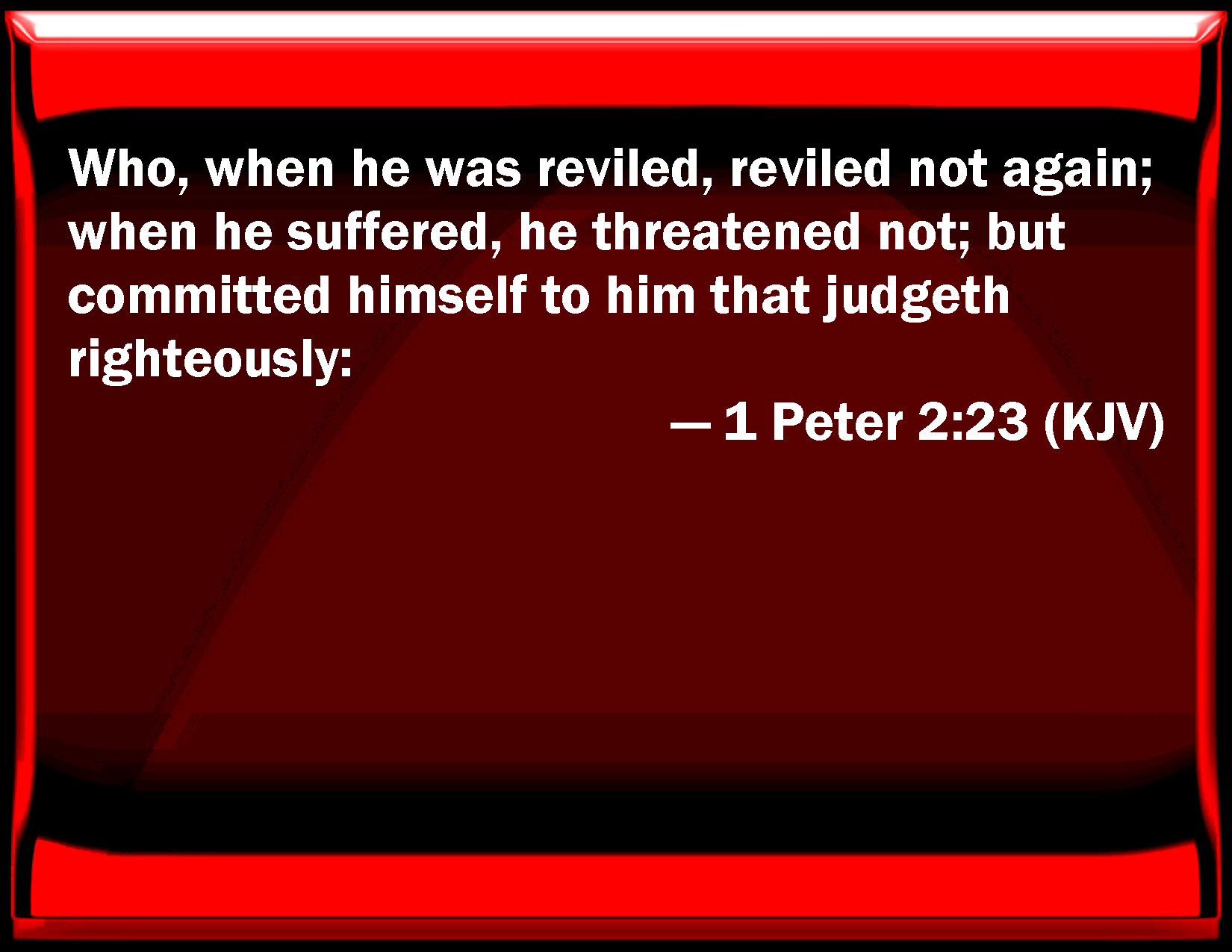 Bible Verse Slide 1 Peter 2:23 Who, when he was reviled, reviled not again; when he suffered, he threatened not; but committed himself to him that judges righteously: KJV: Who, when he was reviled, reviled not again; when he suffered, he threatened not; but committed himself to him that judgeth righteously: DRB: Who, when he was reviled, did not revile: when he suffered, he threatened not: but delivered himself to him that judged him unjustly. DBT: who, when reviled, reviled not again; when suffering, threatened not; but gave himself over into the hands of him who judges righteously; ERV: who, when he was reviled, reviled not again; when he suffered, threatened not; but committed himself to him that judgeth righteously: WBT: Who, when he was reviled, reviled not again; when he suffered, he threatened not; but committed himself to him that judgeth righteously: WEB: Who, when he was cursed, didn't curse back. When he suffered, didn't threaten, but committed himself to him who judges righteously; YLT: who being reviled — was not reviling again, suffering — was not threatening, and was committing himself to Him who is judging righteously,Links 1 Peter 2:23 NIV • 1 Peter 2:23 NLT • 1 Peter 2:23 ESV • 1 Peter 2:23 NASB • 1 Peter 2:23 KJV • 1 Peter 2:23 Interlinear • 1 Peter 2:23 Commentaries • 1 Peter 2:23 Parallel Texts • 1 Peter 2:23 Bible Apps • 1 Peter 2:23 Parallel • Bible Hub |