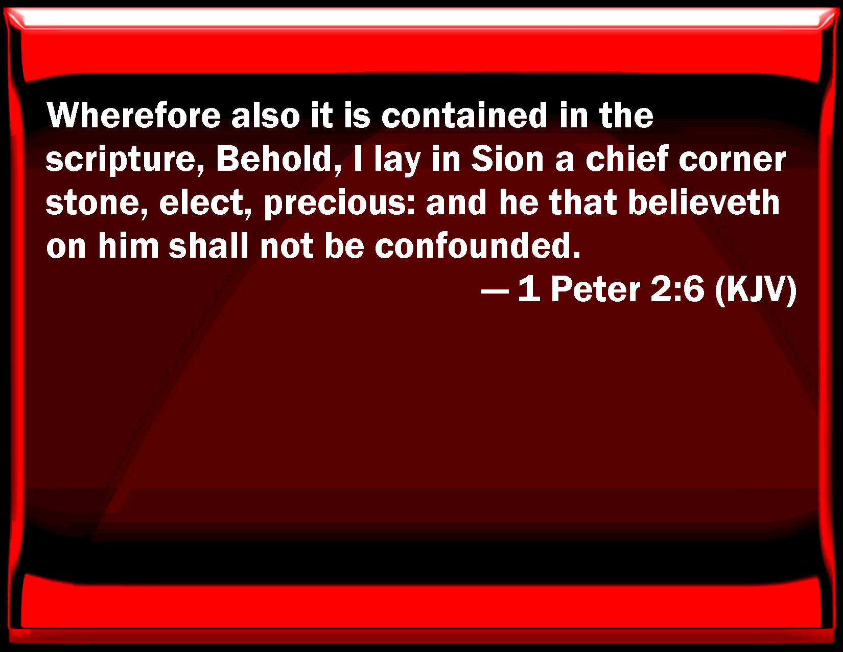 Bible Verse Slide 1 Peter 2:6 Why also it is contained in the scripture, Behold, I lay in Sion a chief corner stone, elect, precious: and he that believes on him shall not be confounded. KJV: Wherefore also it is contained in the scripture, Behold, I lay in Sion a chief corner stone, elect, precious: and he that believeth on him shall not be confounded. DRB: Wherefore it is said in the scripture: Behold, I lay in Sion a chief corner stone, elect, precious. And he that shall believe in him, shall not be confounded. DBT: Because it is contained in the scripture: Behold, I lay in Zion a corner stone, elect, precious: and he that believes on him shall not be put to shame. ERV: Because it is contained in scripture, Behold, I lay in Zion a chief corner stone, elect, precious: And he that believeth on him shall not be put to shame. WBT: Wherefore also it is contained in the scripture, Behold, I lay in Sion a chief corner-stone, elect, precious: and he that believeth on him shall not be confounded. WEB: Because it is contained in Scripture, "Behold, I lay in Zion a chief cornerstone, chosen, and precious: He who believes in him will not be disappointed." YLT: Wherefore, also, it is contained in the Writing: 'Lo, I lay in Zion a chief corner-stone, choice, precious, and he who is believing on him may not be put to shame;'Links 1 Peter 2:6 NIV • 1 Peter 2:6 NLT • 1 Peter 2:6 ESV • 1 Peter 2:6 NASB • 1 Peter 2:6 KJV • 1 Peter 2:6 Interlinear • 1 Peter 2:6 Commentaries • 1 Peter 2:6 Parallel Texts • 1 Peter 2:6 Bible Apps • 1 Peter 2:6 Parallel • Bible Hub |