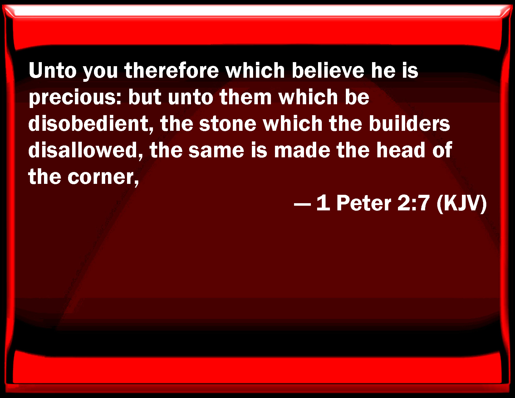 Bible Verse Slide 1 Peter 2:7 To you therefore which believe he is precious: but to them which be disobedient, the stone which the builders disallowed, the same is made the head of the corner, KJV: Unto you therefore which believe he is precious: but unto them which be disobedient, the stone which the builders disallowed, the same is made the head of the corner, DRB: To you therefore that believe, he is honour: but to them that believe not, the stone which the builders rejected, the same is made the head of the corner: DBT: To you therefore who believe is the preciousness; but to the disobedient, the stone which the builders cast away as worthless, this is become head of the corner, ERV: For you therefore which believe is the preciousness: but for such as disbelieve, The stone which the builders rejected, The same was made the head of the corner; WBT: To you therefore who believe he is precious: but to them who are disobedient, the stone which the builders disallowed, the same is made the head of the corner, WEB: For you who believe therefore is the honor, but for those who are disobedient, "The stone which the builders rejected, has become the chief cornerstone," YLT: to you, then, who are believing is the preciousness; and to the unbelieving, a stone that the builders disapproved of, this one did become for the head of a corner,Links 1 Peter 2:7 NIV • 1 Peter 2:7 NLT • 1 Peter 2:7 ESV • 1 Peter 2:7 NASB • 1 Peter 2:7 KJV • 1 Peter 2:7 Interlinear • 1 Peter 2:7 Commentaries • 1 Peter 2:7 Parallel Texts • 1 Peter 2:7 Bible Apps • 1 Peter 2:7 Parallel • Bible Hub |