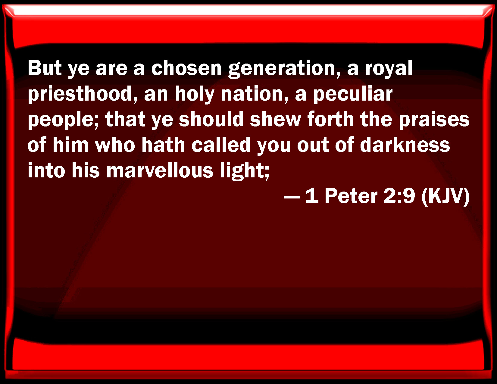 Bible Verse Slide 1 Peter 2:9 But you are a chosen generation, a royal priesthood, an holy nation, a peculiar people; that you should show forth the praises of him who has called you out of darkness into his marvelous light; KJV: But ye are a chosen generation, a royal priesthood, an holy nation, a peculiar people; that ye should shew forth the praises of him who hath called you out of darkness into his marvellous light: DRB: But you are a chosen generation, a kingly priesthood, a holy nation, a purchased people: that you may declare his virtues, who hath called you out of darkness into his marvellous light: DBT: But ye are a chosen race, a kingly priesthood, a holy nation, a people for a possession, that ye might set forth the excellencies of him who has called you out of darkness to his wonderful light; ERV: But ye are an elect race, a royal priesthood, a holy nation, a people for God's own possession, that ye may shew forth the excellencies of him who called you out of darkness into his marvelous light: WBT: But ye are a chosen generation, a royal priesthood, a holy nation, a peculiar people; that ye should show forth the praises of him who hath called you out of darkness into his marvelous light: WEB: But you are a chosen race, a royal priesthood, a holy nation, a people for God's own possession, that you may proclaim the excellence of him who called you out of darkness into his marvelous light: YLT: and ye are a choice race, a royal priesthood, a holy nation, a people acquired, that the excellences ye may shew forth of Him who out of darkness did call you to His wondrous light;Links 1 Peter 2:9 NIV • 1 Peter 2:9 NLT • 1 Peter 2:9 ESV • 1 Peter 2:9 NASB • 1 Peter 2:9 KJV • 1 Peter 2:9 Interlinear • 1 Peter 2:9 Commentaries • 1 Peter 2:9 Parallel Texts • 1 Peter 2:9 Bible Apps • 1 Peter 2:9 Parallel • Bible Hub |