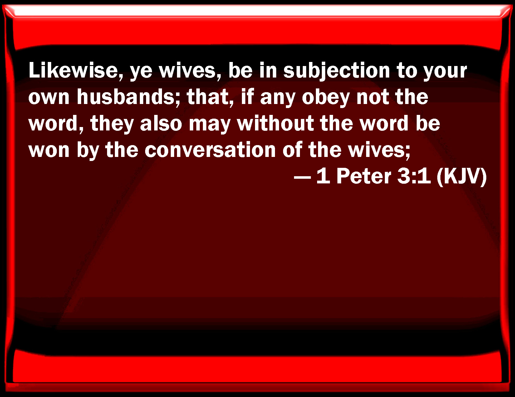 Bible Verse Slide 1 Peter 3:1 Likewise, you wives, be in subjection to your own husbands; that, if any obey not the word, they also may without the word be won by the conversation of the wives; KJV: Likewise, ye wives, be in subjection to your own husbands; that, if any obey not the word, they also may without the word be won by the conversation of the wives; DRB: In like manner also let wives be subject to their husbands: that if any believe not the word, they may be won without the word, by the conversation of the wives. DBT: Likewise, wives, be subject to your own husbands, that, even if any are disobedient to the word, they may be gained without the word by the conversation of the wives, ERV: In like manner, ye wives, be in subjection to your own husbands; that, even if any obey not the word, they may without the word be gained by the behaviour of their wives; WBT: Likewise, ye wives, be in subjection to your own husbands; that, if any obey not the word, they also may without the word be won by the deportment of the wives; WEB: In the same way, wives, be in subjection to your own husbands; so that, even if any don't obey the Word, they may be won by the behavior of their wives without a word; YLT: In like manner, the wives, be ye subject to your own husbands, that even if certain are disobedient to the word, through the conversation of the wives, without the word, they may be won,Links 1 Peter 3:1 NIV • 1 Peter 3:1 NLT • 1 Peter 3:1 ESV • 1 Peter 3:1 NASB • 1 Peter 3:1 KJV • 1 Peter 3:1 Interlinear • 1 Peter 3:1 Commentaries • 1 Peter 3:1 Parallel Texts • 1 Peter 3:1 Bible Apps • 1 Peter 3:1 Parallel • Bible Hub |