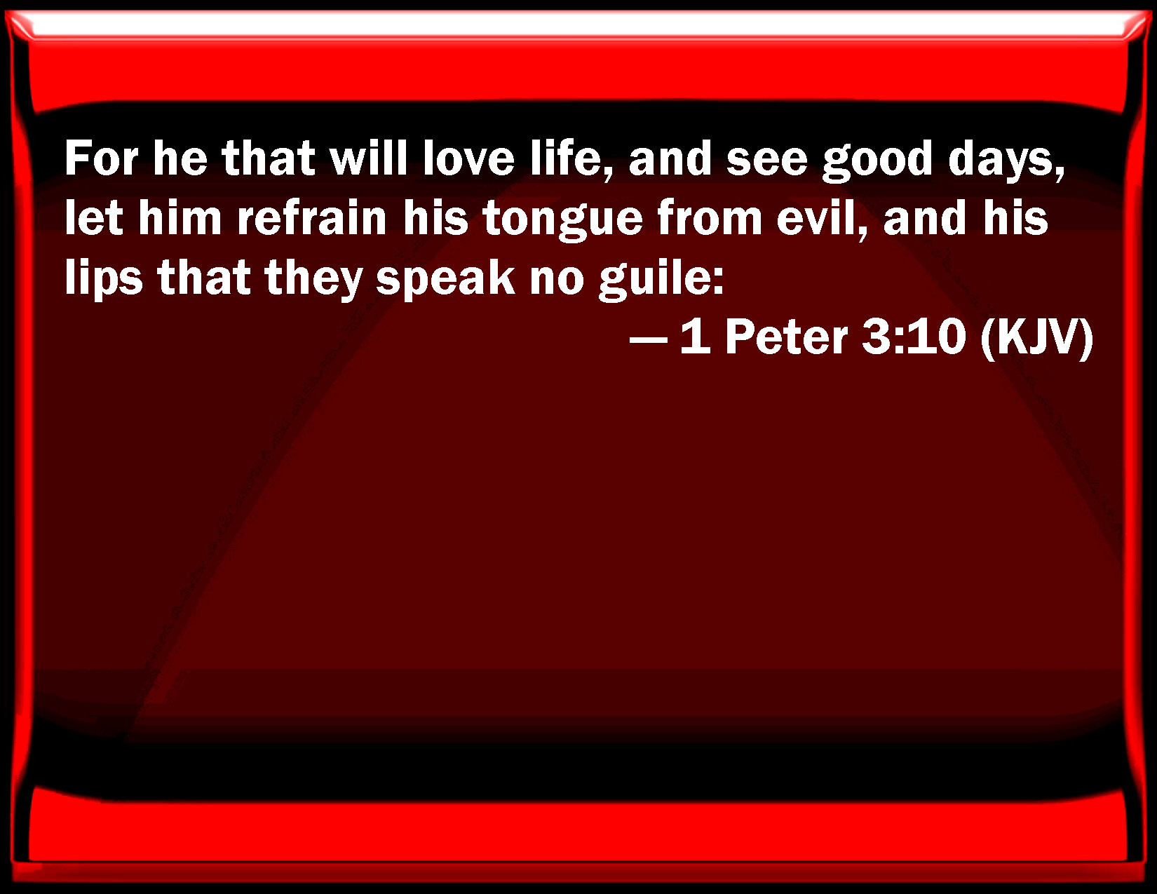 Bible Verse Slide 1 Peter 3:10 For he that will love life, and see good days, let him refrain his tongue from evil, and his lips that they speak no guile: KJV: For he that will love life, and see good days, let him refrain his tongue from evil, and his lips that they speak no guile: DRB: For he that will love life, and see good days, let him refrain his tongue from evil, and his lips that they speak no guile. DBT: For he that will love life and see good days, let him cause his tongue to cease from evil and his lips that they speak no guile. ERV: For, He that would love life, And see good days, Let him refrain his tongue from evil, And his lips that they speak no guile: WBT: For he that will love life, and see good days, let him restrain his tongue from evil, and his lips that they speak no guile: WEB: For, "He who would love life, and see good days, let him keep his tongue from evil, and his lips from speaking deceit. YLT: for 'he who is willing to love life, and to see good days, let him guard his tongue from evil, and his lips — not to speak guile;Links 1 Peter 3:10 NIV • 1 Peter 3:10 NLT • 1 Peter 3:10 ESV • 1 Peter 3:10 NASB • 1 Peter 3:10 KJV • 1 Peter 3:10 Interlinear • 1 Peter 3:10 Commentaries • 1 Peter 3:10 Parallel Texts • 1 Peter 3:10 Bible Apps • 1 Peter 3:10 Parallel • Bible Hub |