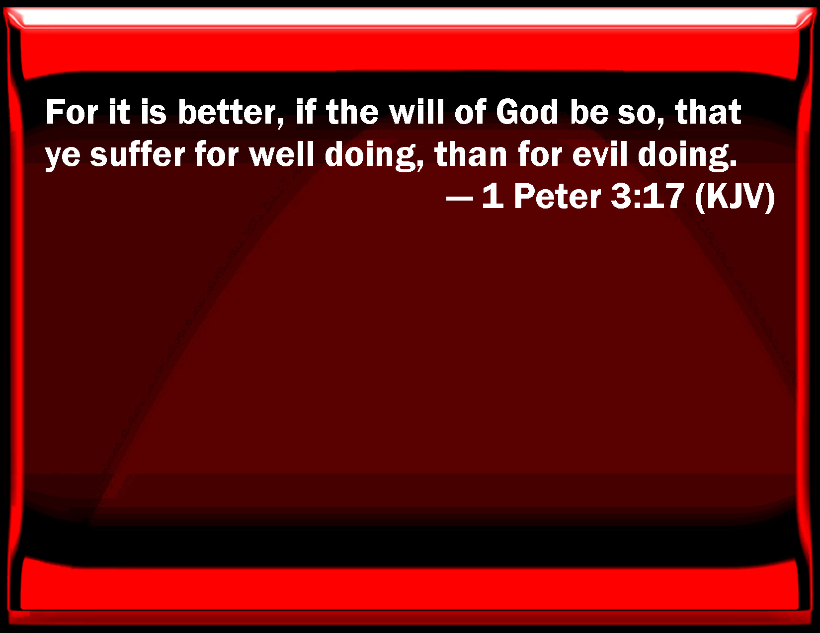 Bible Verse Slide 1 Peter 3:17 For it is better, if the will of God be so, that you suffer for well doing, than for evil doing. KJV: For it is better, if the will of God be so, that ye suffer for well doing, than for evil doing. DRB: For it is better doing well (if such be the will of God) to suffer, than doing ill. DBT: For it is better, if the will of God should will it, to suffer as well-doers than as evildoers; ERV: For it is better, if the will of God should so will, that ye suffer for well-doing than for evil-doing. WBT: For it is better, if the will of God is so, that ye suffer for well-doing, than for evil-doing. WEB: For it is better, if it is God's will, that you suffer for doing well than for doing evil. YLT: for it is better doing good, if the will of God will it, to suffer, than doing evil;Links 1 Peter 3:17 NIV • 1 Peter 3:17 NLT • 1 Peter 3:17 ESV • 1 Peter 3:17 NASB • 1 Peter 3:17 KJV • 1 Peter 3:17 Interlinear • 1 Peter 3:17 Commentaries • 1 Peter 3:17 Parallel Texts • 1 Peter 3:17 Bible Apps • 1 Peter 3:17 Parallel • Bible Hub |