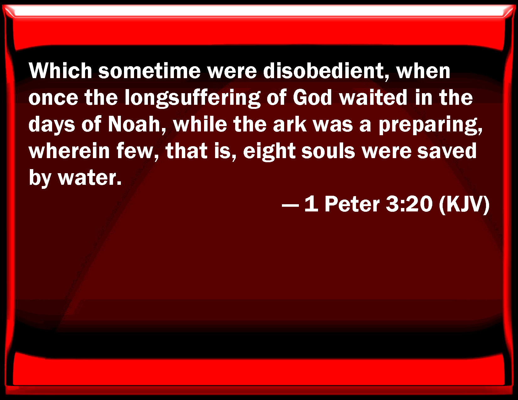 Bible Verse Slide 1 Peter 3:20 Which sometime were disobedient, when once the long-suffering of God waited in the days of Noah, while the ark was a preparing, wherein few, that is, eight souls were saved by water. KJV: Which sometime were disobedient, when once the longsuffering of God waited in the days of Noah, while the ark was a preparing, wherein few, that is, eight souls were saved by water. DRB: Which had been some time incredulous, when they waited for the patience of God in the days of Noe, when the ark was a building: wherein a few, that is, eight souls, were saved by water. DBT: heretofore disobedient, when the longsuffering of God waited in the days of Noah while the ark was preparing, into which few, that is, eight souls, were saved through water: ERV: which aforetime were disobedient, when the longsuffering of God waited in the days of Noah, while the ark was a preparing, wherein few, that is, eight souls, were saved through water: WBT: Who formerly were disobedient, when once the long-suffering of God waited in the days of Noah, while the ark was preparing, in which few, that is, eight souls, were saved by water. WEB: who before were disobedient, when God waited patiently in the days of Noah, while the ship was being built. In it, few, that is, eight souls, were saved through water. YLT: who sometime disbelieved, when once the long-suffering of God did wait, in days of Noah — an ark being preparing — in which few, that is, eight souls, were saved through water;Links 1 Peter 3:20 NIV • 1 Peter 3:20 NLT • 1 Peter 3:20 ESV • 1 Peter 3:20 NASB • 1 Peter 3:20 KJV • 1 Peter 3:20 Interlinear • 1 Peter 3:20 Commentaries • 1 Peter 3:20 Parallel Texts • 1 Peter 3:20 Bible Apps • 1 Peter 3:20 Parallel • Bible Hub |