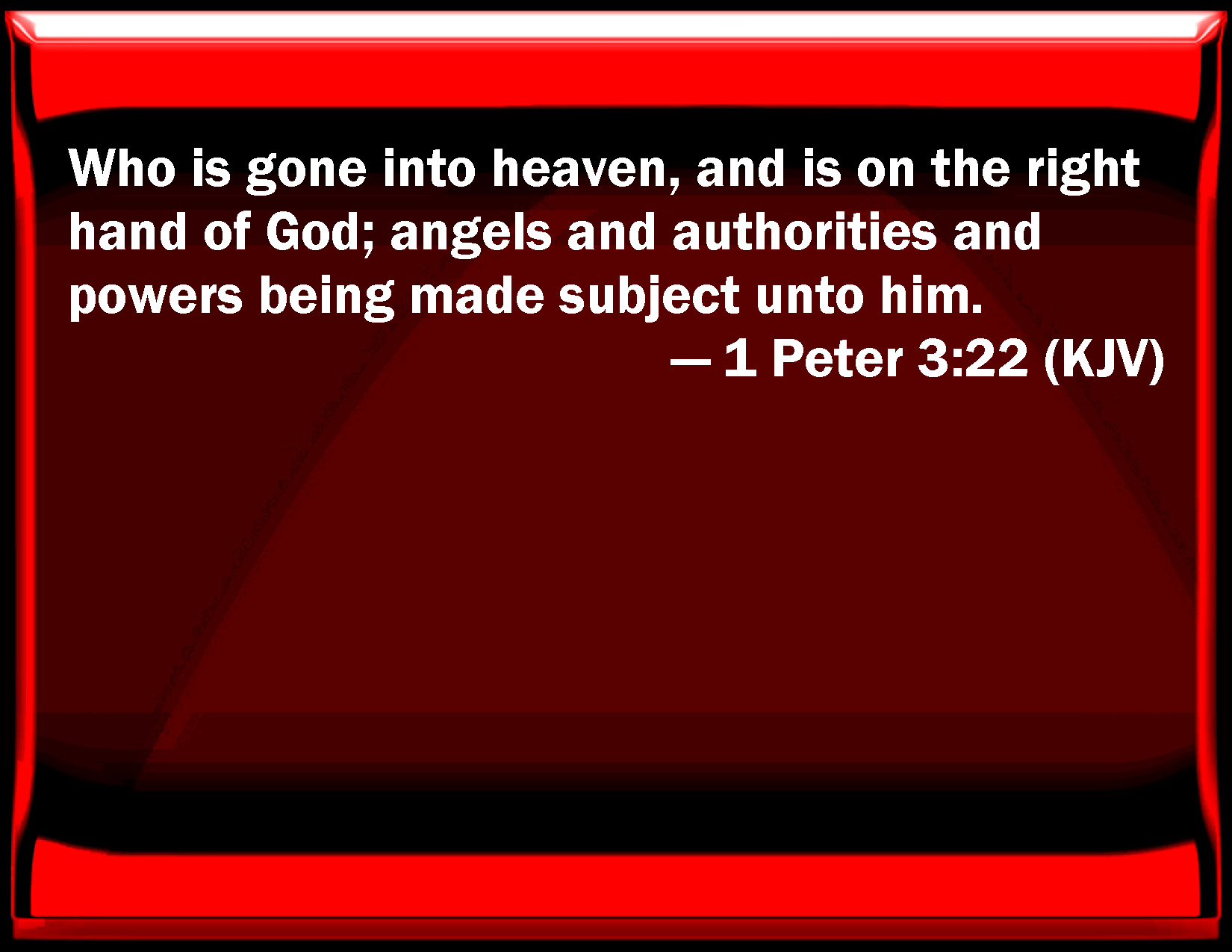Bible Verse Slide 1 Peter 3:22 Who is gone into heaven, and is on the right hand of God; angels and authorities and powers being made subject to him. KJV: Who is gone into heaven, and is on the right hand of God; angels and authorities and powers being made subject unto him. DRB: Who is on the right hand of God, swallowing down death, that we might be made heirs of life everlasting: being gone into heaven, the angels and powers and virtues being made subject to him. DBT: who is at the right hand of God, gone into heaven, angels and authorities and powers being subjected to him. ERV: who is on the right hand of God, having gone into heaven; angels and authorities and powers being made subject unto him. WBT: Who is gone into heaven, and is on the right hand of God; angels, and authorities, and powers being made subject to him. WEB: who is at the right hand of God, having gone into heaven, angels and authorities and powers being made subject to him. YLT: who is at the right hand of God, having gone on to heaven — messengers, and authorities, and powers, having been subjected to him.Links 1 Peter 3:22 NIV • 1 Peter 3:22 NLT • 1 Peter 3:22 ESV • 1 Peter 3:22 NASB • 1 Peter 3:22 KJV • 1 Peter 3:22 Interlinear • 1 Peter 3:22 Commentaries • 1 Peter 3:22 Parallel Texts • 1 Peter 3:22 Bible Apps • 1 Peter 3:22 Parallel • Bible Hub |