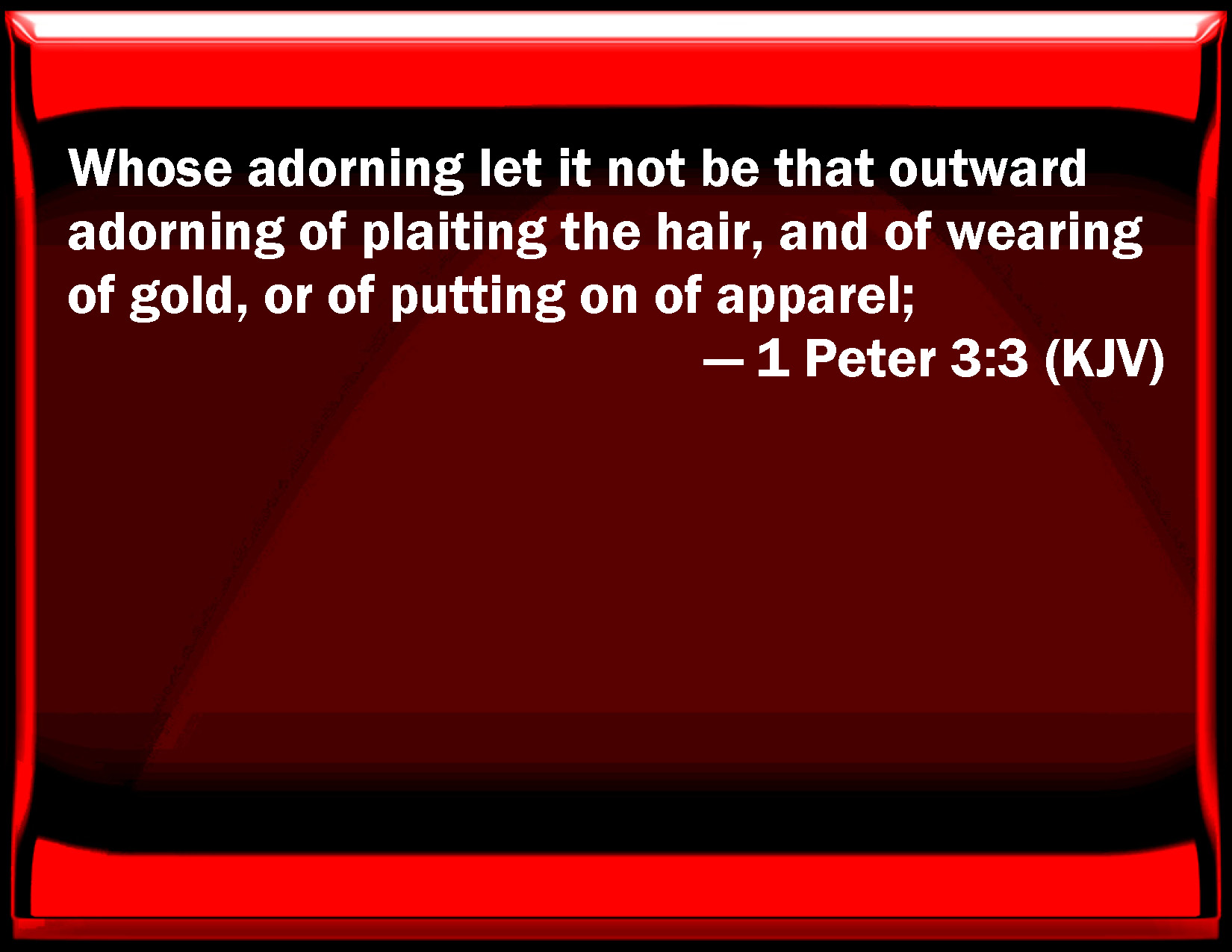 Bible Verse Slide 1 Peter 3:3 Whose adorning let it not be that outward adorning of plaiting the hair, and of wearing of gold, or of putting on of apparel; KJV: Whose adorning let it not be that outward adorning of plaiting the hair, and of wearing of gold, or of putting on of apparel; DRB: Whose adorning let it not be the outward plaiting of the hair, or the wearing of gold, or the putting on of apparel: DBT: whose adorning let it not be that outward one of tressing of hair, and wearing gold, or putting on apparel; ERV: Whose adorning let it not be the outward adorning of plaiting the hair, and of wearing jewels of gold, or of putting on apparel; WBT: Whose adorning let it not be that outward adorning of plaiting the hair, and of wearing gold, or of putting on apparel; WEB: Let your beauty be not just the outward adorning of braiding the hair, and of wearing jewels of gold, or of putting on fine clothing; YLT: whose adorning — let it not be that which is outward, of plaiting of hair, and of putting around of things of gold, or of putting on of garments,Links 1 Peter 3:3 NIV • 1 Peter 3:3 NLT • 1 Peter 3:3 ESV • 1 Peter 3:3 NASB • 1 Peter 3:3 KJV • 1 Peter 3:3 Interlinear • 1 Peter 3:3 Commentaries • 1 Peter 3:3 Parallel Texts • 1 Peter 3:3 Bible Apps • 1 Peter 3:3 Parallel • Bible Hub |