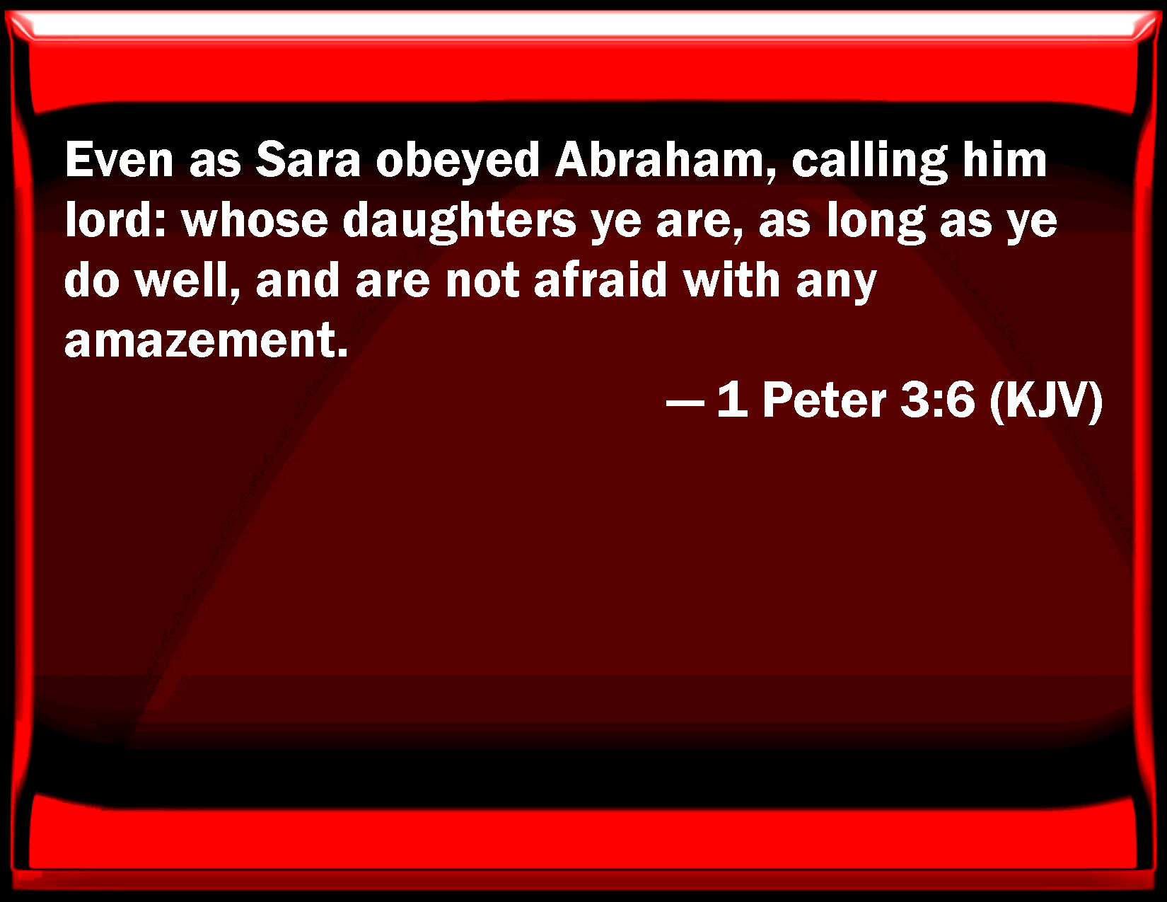 Bible Verse Slide 1 Peter 3:6 Even as Sara obeyed Abraham, calling him lord: whose daughters you are, as long as you do well, and are not afraid with any amazement. KJV: Even as Sara obeyed Abraham, calling him lord: whose daughters ye are, as long as ye do well, and are not afraid with any amazement. DRB: As Sara obeyed Abraham, calling him lord: whose daughters you are, doing well, and not fearing any disturbance. DBT: as Sarah obeyed Abraham, calling him lord; whose children ye have become, doing good, and not fearing with any kind of consternation. ERV: as Sarah obeyed Abraham, calling him lord: whose children ye now are, if ye do well, and are not put in fear by any terror. WBT: Even as Sarah obeyed Abraham, calling him lord: whose daughters ye are, as long as ye do well, and are not afraid with any amazement. WEB: as Sarah obeyed Abraham, calling him lord, whose children you now are, if you do well, and are not put in fear by any terror. YLT: as Sarah was obedient to Abraham, calling him 'sir,' of whom ye did become daughters, doing good, and not fearing any terror.Links 1 Peter 3:6 NIV • 1 Peter 3:6 NLT • 1 Peter 3:6 ESV • 1 Peter 3:6 NASB • 1 Peter 3:6 KJV • 1 Peter 3:6 Interlinear • 1 Peter 3:6 Commentaries • 1 Peter 3:6 Parallel Texts • 1 Peter 3:6 Bible Apps • 1 Peter 3:6 Parallel • Bible Hub |
