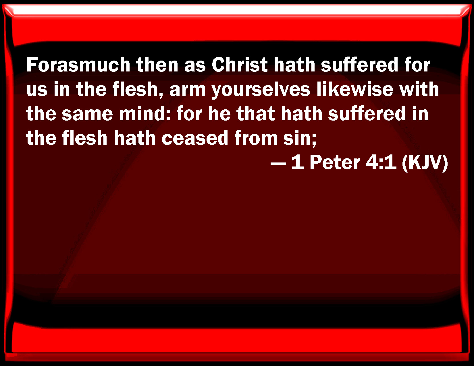 Bible Verse Slide 1 Peter 4:1 For as much then as Christ has suffered for us in the flesh, arm yourselves likewise with the same mind: for he that has suffered in the flesh has ceased from sin; KJV: Forasmuch then as Christ hath suffered for us in the flesh, arm yourselves likewise with the same mind: for he that hath suffered in the flesh hath ceased from sin; DRB: Christ therefore having suffered in the flesh, be you also armed with the same thought: for he that hath suffered in the flesh, hath ceased from sins: DBT: Christ, then, having suffered for us in the flesh, do ye also arm yourselves with the same mind; for he that has suffered in the flesh has done with sin, ERV: Forasmuch then as Christ suffered in the flesh, arm ye yourselves also with the same mind; for he that hath suffered in the flesh hath ceased from sin; WBT: Forasmuch then as Christ hath suffered for us in the flesh, arm yourselves likewise with the same mind: for he that hath suffered in the flesh hath ceased from sin; WEB: Forasmuch then as Christ suffered for us in the flesh, arm yourselves also with the same mind; for he who has suffered in the flesh has ceased from sin; YLT: Christ, then, having suffered for us in the flesh, ye also with the same mind arm yourselves, because he who did suffer in the flesh hath done with sin,Links 1 Peter 4:1 NIV • 1 Peter 4:1 NLT • 1 Peter 4:1 ESV • 1 Peter 4:1 NASB • 1 Peter 4:1 KJV • 1 Peter 4:1 Interlinear • 1 Peter 4:1 Commentaries • 1 Peter 4:1 Parallel Texts • 1 Peter 4:1 Bible Apps • 1 Peter 4:1 Parallel • Bible Hub |
