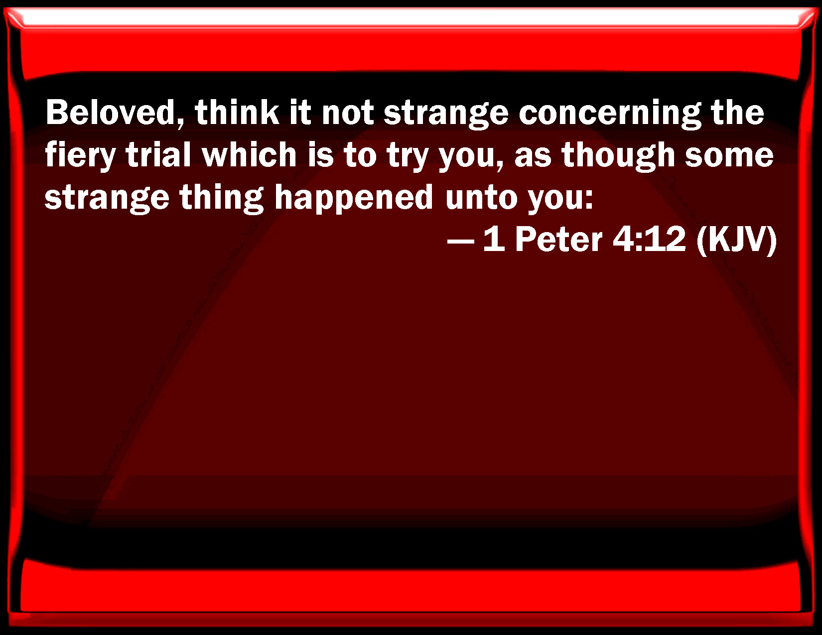 Bible Verse Slide 1 Peter 4:12 Beloved, think it not strange concerning the fiery trial which is to try you, as though some strange thing happened to you: KJV: Beloved, think it not strange concerning the fiery trial which is to try you, as though some strange thing happened unto you: DRB: Dearly beloved, think not strange the burning heat which is to try you, as if some new thing happened to you; DBT: Beloved, take not as strange the fire of persecution which has taken place amongst you for your trial, as if a strange thing was happening to you; ERV: Beloved, think it not strange concerning the fiery trial among you, which cometh upon you to prove you, as though a strange thing happened unto you: WBT: Beloved, think it not strange concerning the fiery trial which is to try you, as though some strange thing happened to you: WEB: Beloved, don't be astonished at the fiery trial which has come upon you, to test you, as though a strange thing happened to you. YLT: Beloved, think it not strange at the fiery suffering among you that is coming to try you, as if a strange thing were happening to you,Links 1 Peter 4:12 NIV • 1 Peter 4:12 NLT • 1 Peter 4:12 ESV • 1 Peter 4:12 NASB • 1 Peter 4:12 KJV • 1 Peter 4:12 Interlinear • 1 Peter 4:12 Commentaries • 1 Peter 4:12 Parallel Texts • 1 Peter 4:12 Bible Apps • 1 Peter 4:12 Parallel • Bible Hub |