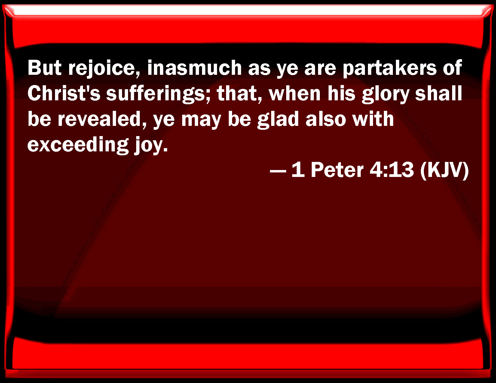Bible Verse Slide 1 Peter 4:13 But rejoice, inasmuch as you are partakers of Christ's sufferings; that, when his glory shall be revealed, you may be glad also with exceeding joy. KJV: But rejoice, inasmuch as ye are partakers of Christ's sufferings; that, when his glory shall be revealed, ye may be glad also with exceeding joy. DRB: But if you partake of the sufferings of Christ, rejoice that when his glory shall be revealed, you may also be glad with exceeding joy. DBT: but as ye have share in the sufferings of Christ, rejoice, that in the revelation of his glory also ye may rejoice with exultation. ERV: but insomuch as ye are partakers of Christ's sufferings, rejoice; that at the revelation of his glory also ye may rejoice with exceeding joy. WBT: But rejoice, seeing ye are partakers of Christ's sufferings; that, when his glory shall be revealed, ye may be glad also with exceeding joy. WEB: But because you are partakers of Christ's sufferings, rejoice; that at the revelation of his glory you also may rejoice with exceeding joy. YLT: but, according as ye have fellowship with the sufferings of the Christ, rejoice ye, that also in the revelation of his glory ye may rejoice — exulting;Links 1 Peter 4:13 NIV • 1 Peter 4:13 NLT • 1 Peter 4:13 ESV • 1 Peter 4:13 NASB • 1 Peter 4:13 KJV • 1 Peter 4:13 Interlinear • 1 Peter 4:13 Commentaries • 1 Peter 4:13 Parallel Texts • 1 Peter 4:13 Bible Apps • 1 Peter 4:13 Parallel • Bible Hub |