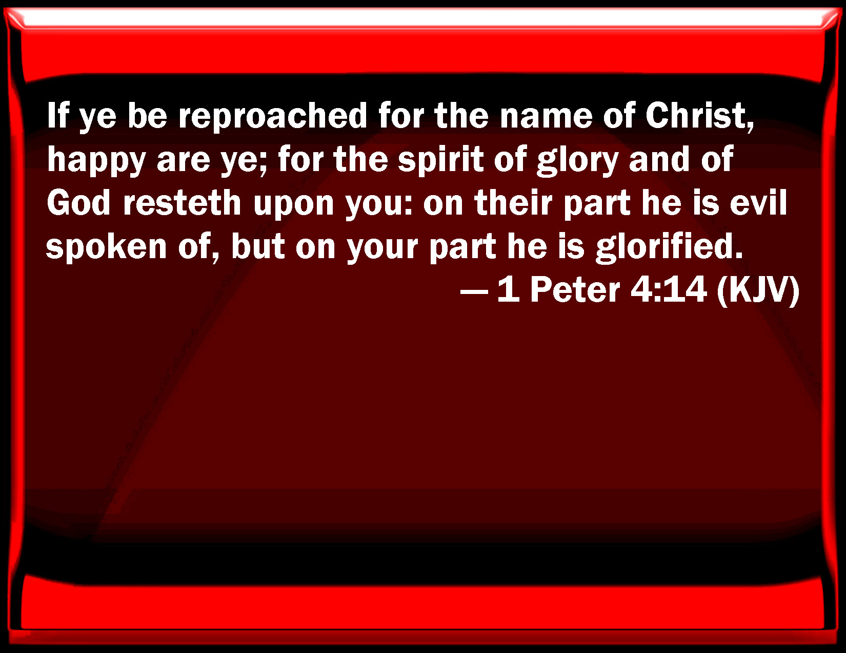 Bible Verse Slide 1 Peter 4:14 If you be reproached for the name of Christ, happy are you; for the spirit of glory and of God rests on you: on their part he is evil spoken of, but on your part he is glorified. KJV: If ye be reproached for the name of Christ, happy are ye; for the spirit of glory and of God resteth upon you: on their part he is evil spoken of, but on your part he is glorified. DRB: If you be reproached for the name of Christ, you shall be blessed: for that which is of the honour, glory, and power of God, and that which is his Spirit, resteth upon you. DBT: If ye are reproached in the name of Christ, blessed are ye; for the Spirit of glory and the Spirit of God rests upon you: on their part he is blasphemed, but on your part he is glorified. ERV: If ye are reproached for the name of Christ, blessed are ye; because the Spirit of glory and the Spirit of God resteth upon you. WBT: If ye are reproached for the name of Christ, happy are ye; for the spirit of glory and of God resteth upon you. On their part he is evil spoken of, but on your part he is glorified. WEB: If you are insulted for the name of Christ, you are blessed; because the Spirit of glory and of God rests on you. On their part he is blasphemed, but on your part he is glorified. YLT: if ye be reproached in the name of Christ — happy are ye, because the Spirit of glory and of God upon you doth rest; in regard, indeed, to them, he is evil-spoken of, and in regard to you, he is glorified;Links 1 Peter 4:14 NIV • 1 Peter 4:14 NLT • 1 Peter 4:14 ESV • 1 Peter 4:14 NASB • 1 Peter 4:14 KJV • 1 Peter 4:14 Interlinear • 1 Peter 4:14 Commentaries • 1 Peter 4:14 Parallel Texts • 1 Peter 4:14 Bible Apps • 1 Peter 4:14 Parallel • Bible Hub |