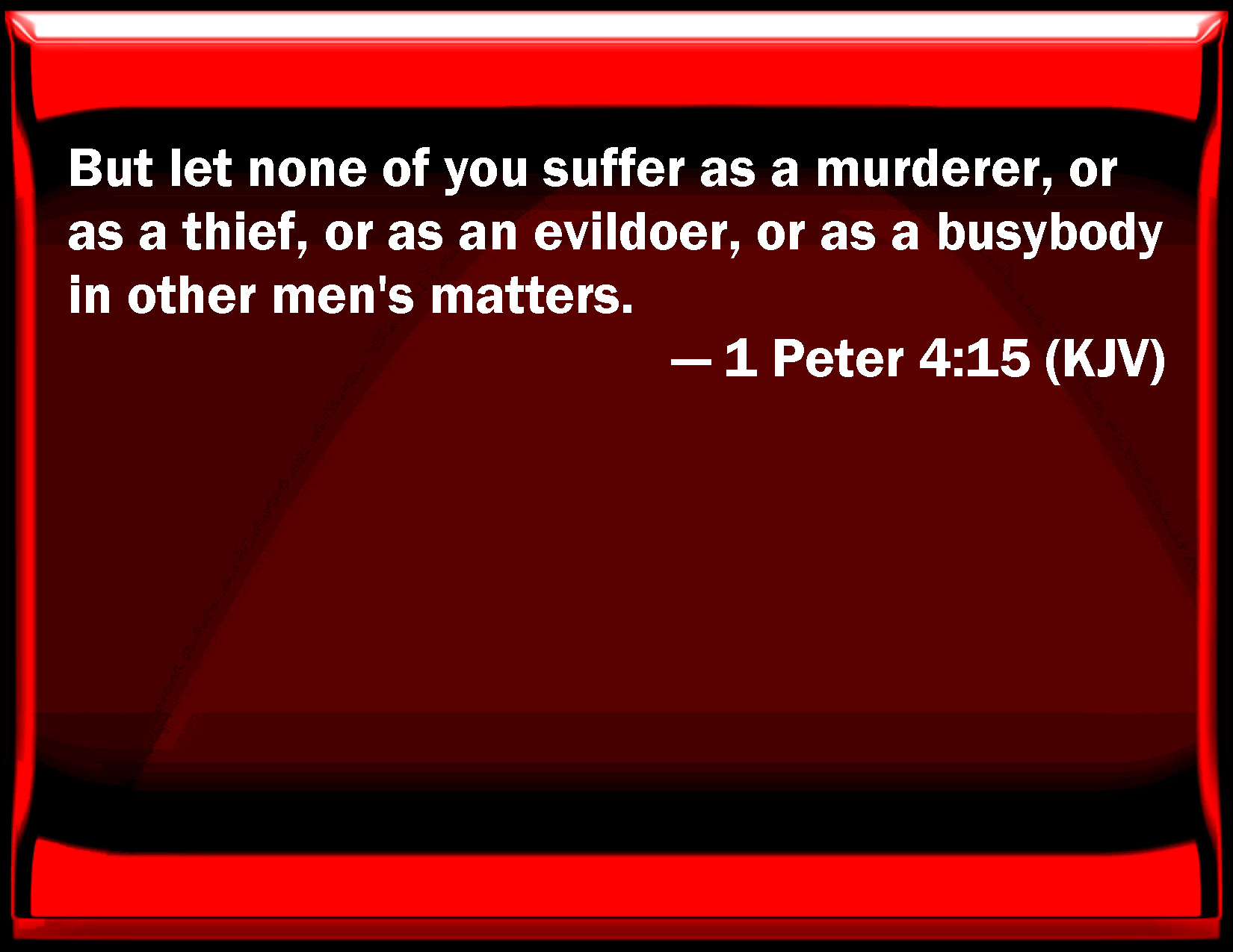 Bible Verse Slide 1 Peter 4:15 But let none of you suffer as a murderer, or as a thief, or as an evildoer, or as a busybody in other men's matters. KJV: But let none of you suffer as a murderer, or as a thief, or as an evildoer, or as a busybody in other men's matters. DRB: But let none of you suffer as a murderer, or a thief, or a railer, or a coveter of other men's things. DBT: Let none of you suffer indeed as murderer, or thief, or evildoer, or as overseer of other people's matters; ERV: For let none of you suffer as a murderer, or a thief, or an evil-doer, or as a meddler in other men's matters: WBT: But let none of you suffer as a murderer, or as a thief, or as an evil-doer, or as a busy-body in other men's matters. WEB: For let none of you suffer as a murderer, or a thief, or an evil doer, or a meddler in other men's matters. YLT: for let none of you suffer as a murderer, or thief, or evil-doer, or as an inspector into other men's matters;Links 1 Peter 4:15 NIV • 1 Peter 4:15 NLT • 1 Peter 4:15 ESV • 1 Peter 4:15 NASB • 1 Peter 4:15 KJV • 1 Peter 4:15 Interlinear • 1 Peter 4:15 Commentaries • 1 Peter 4:15 Parallel Texts • 1 Peter 4:15 Bible Apps • 1 Peter 4:15 Parallel • Bible Hub |