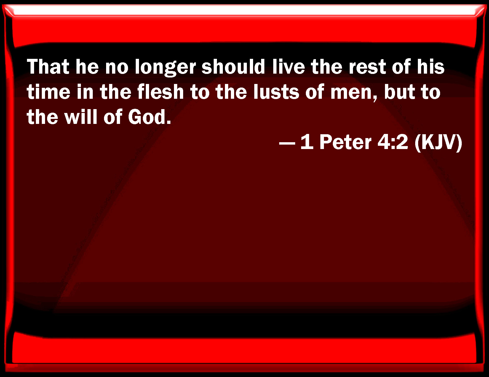 Bible Verse Slide 1 Peter 4:2 That he no longer should live the rest of his time in the flesh to the lusts of men, but to the will of God. KJV: That he no longer should live the rest of his time in the flesh to the lusts of men, but to the will of God. DRB: That now he may live the rest of his time in the flesh , not after the desires of men, but according to the will of God. DBT: no longer to live the rest of his time in the flesh to men's lusts, but to God's will. ERV: that ye no longer should live the rest of your time in the flesh to the lusts of men, but to the will of God. WBT: That he no longer should live the rest of his time in the flesh to the lusts of men, but to the will of God. WEB: that you no longer should live the rest of your time in the flesh for the lusts of men, but for the will of God. YLT: no more in the desires of men, but in the will of God, to live the rest of the time in the flesh;Links 1 Peter 4:2 NIV • 1 Peter 4:2 NLT • 1 Peter 4:2 ESV • 1 Peter 4:2 NASB • 1 Peter 4:2 KJV • 1 Peter 4:2 Interlinear • 1 Peter 4:2 Commentaries • 1 Peter 4:2 Parallel Texts • 1 Peter 4:2 Bible Apps • 1 Peter 4:2 Parallel • Bible Hub |