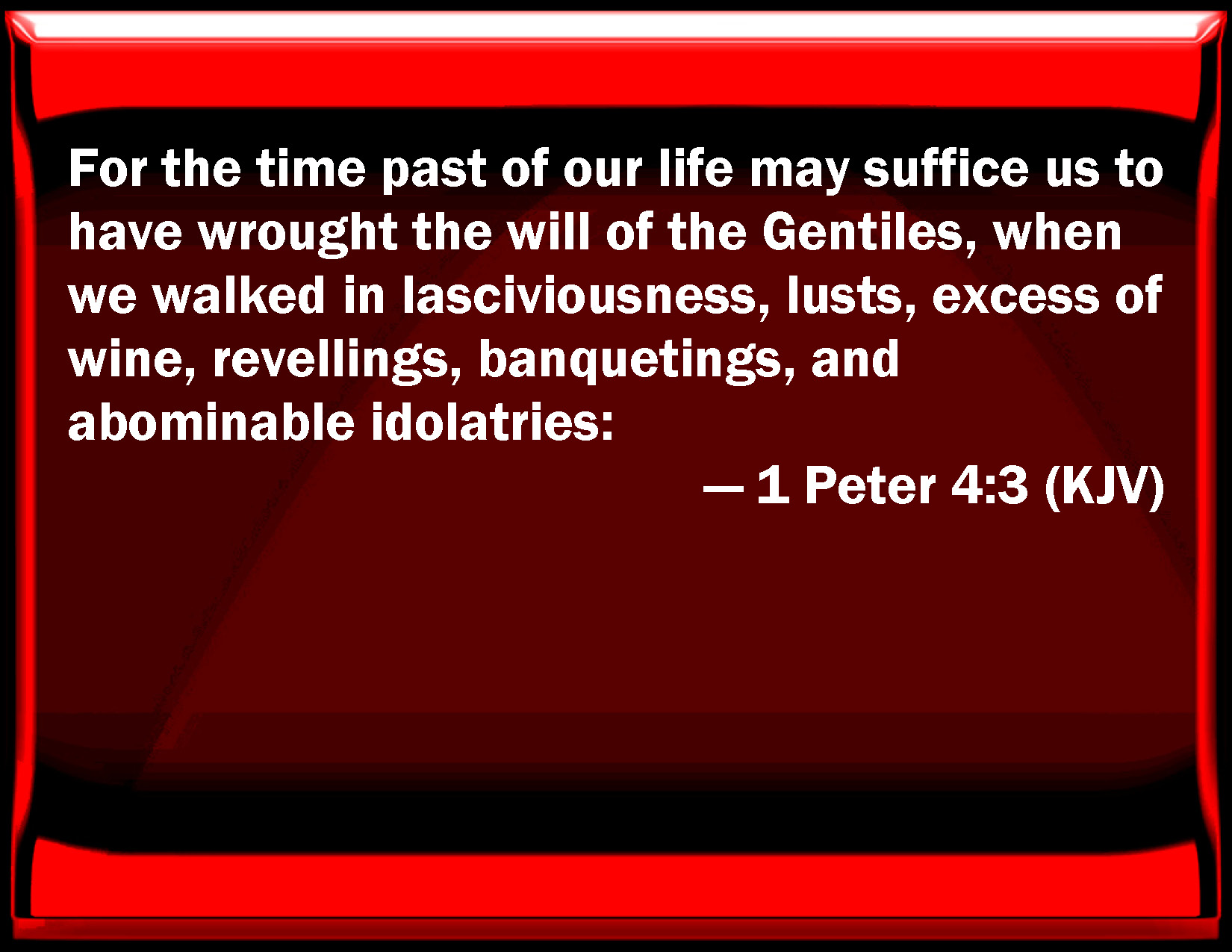 Bible Verse Slide 1 Peter 4:3 For the time past of our life may suffice us to have worked the will of the Gentiles, when we walked in lasciviousness, lusts, excess of wine, revelings, parties, and abominable idolatries: KJV: For the time past of our life may suffice us to have wrought the will of the Gentiles, when we walked in lasciviousness, lusts, excess of wine, revellings, banquetings, and abominable idolatries: DRB: For the time past is sufficient to have fulfilled the will of the Gentiles, for them who have walked in riotousness, lusts, excess of wine, revellings, banquetings, and unlawful worshipping of idols. DBT: For the time past is sufficient for us to have wrought the will of the Gentiles, walking in lasciviousness, lusts, wine-drinking, revels, drinkings, and unhallowed idolatries. ERV: For the time past may suffice to have wrought the desire of the Gentiles, and to have walked in lasciviousness, lusts, winebibbings, revellings, carousings, and abominable idolatries: WBT: For the time past of our life may suffice us to have wrought the will of the Gentiles, when we walked in lasciviousness, lusts, excess of wine, revelings, banquetings, and abominable idolatries: WEB: For we have spent enough of our past time doing the desire of the Gentiles, and having walked in lewdness, lusts, drunken binges, orgies, carousings, and abominable idolatries. YLT: for sufficient to us is the past time of life the will of the nations to have wrought, having walked in lasciviousnesses, desires, excesses of wines, revellings, drinking-bouts, and unlawful idolatries,Links 1 Peter 4:3 NIV • 1 Peter 4:3 NLT • 1 Peter 4:3 ESV • 1 Peter 4:3 NASB • 1 Peter 4:3 KJV • 1 Peter 4:3 Interlinear • 1 Peter 4:3 Commentaries • 1 Peter 4:3 Parallel Texts • 1 Peter 4:3 Bible Apps • 1 Peter 4:3 Parallel • Bible Hub |