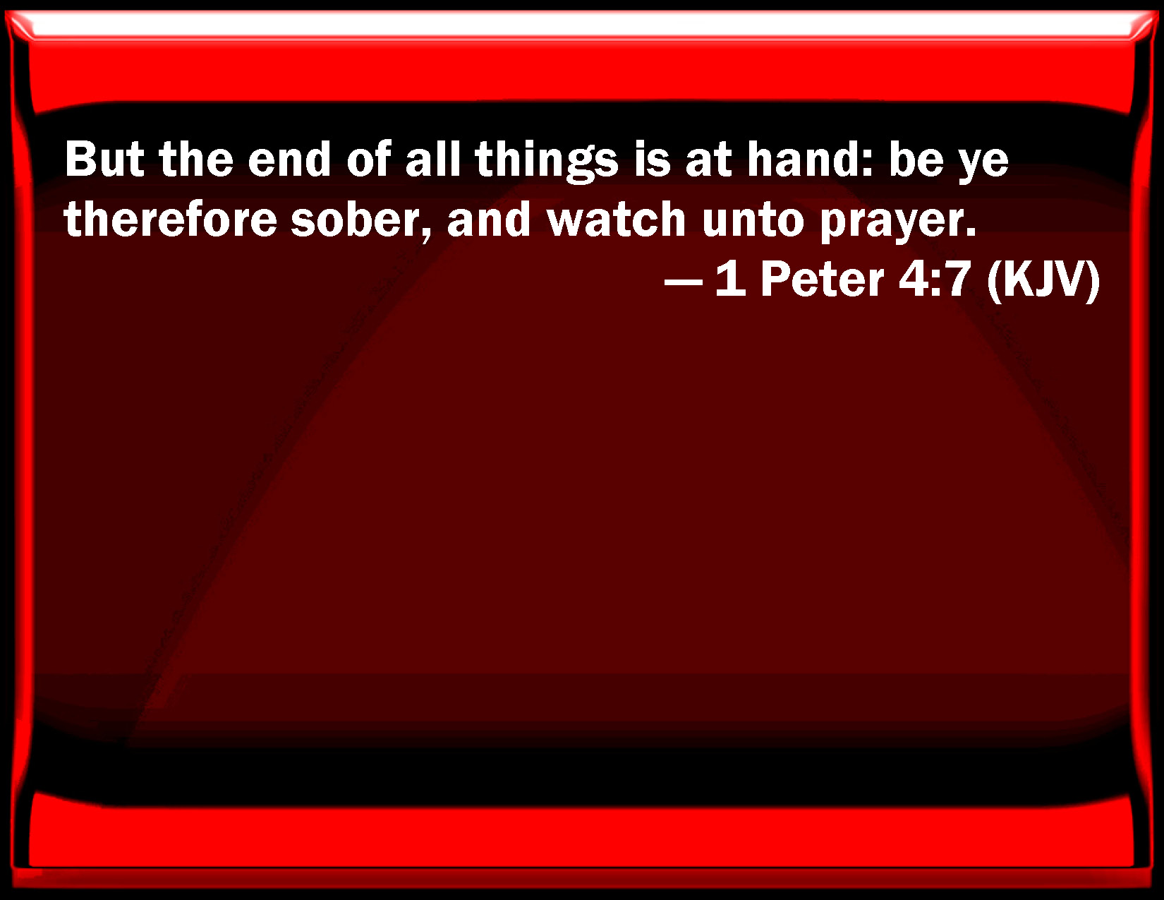 Bible Verse Slide 1 Peter 4:7 But the end of all things is at hand: be you therefore sober, and watch to prayer. KJV: But the end of all things is at hand: be ye therefore sober, and watch unto prayer. DRB: But the end of all is at hand. Be prudent therefore, and watch in prayers. DBT: But the end of all things is drawn nigh: be sober therefore, and be watchful unto prayers; ERV: But the end of all things is at hand: be ye therefore of sound mind, and be sober unto prayer: WBT: But the end of all things is at hand: be ye therefore sober, and watch to prayer. WEB: But the end of all things is near. Therefore be of sound mind, self-controlled, and sober in prayer. YLT: And of all things the end hath come nigh; be sober-minded, then, and watch unto the prayers,Links 1 Peter 4:7 NIV • 1 Peter 4:7 NLT • 1 Peter 4:7 ESV • 1 Peter 4:7 NASB • 1 Peter 4:7 KJV • 1 Peter 4:7 Interlinear • 1 Peter 4:7 Commentaries • 1 Peter 4:7 Parallel Texts • 1 Peter 4:7 Bible Apps • 1 Peter 4:7 Parallel • Bible Hub |