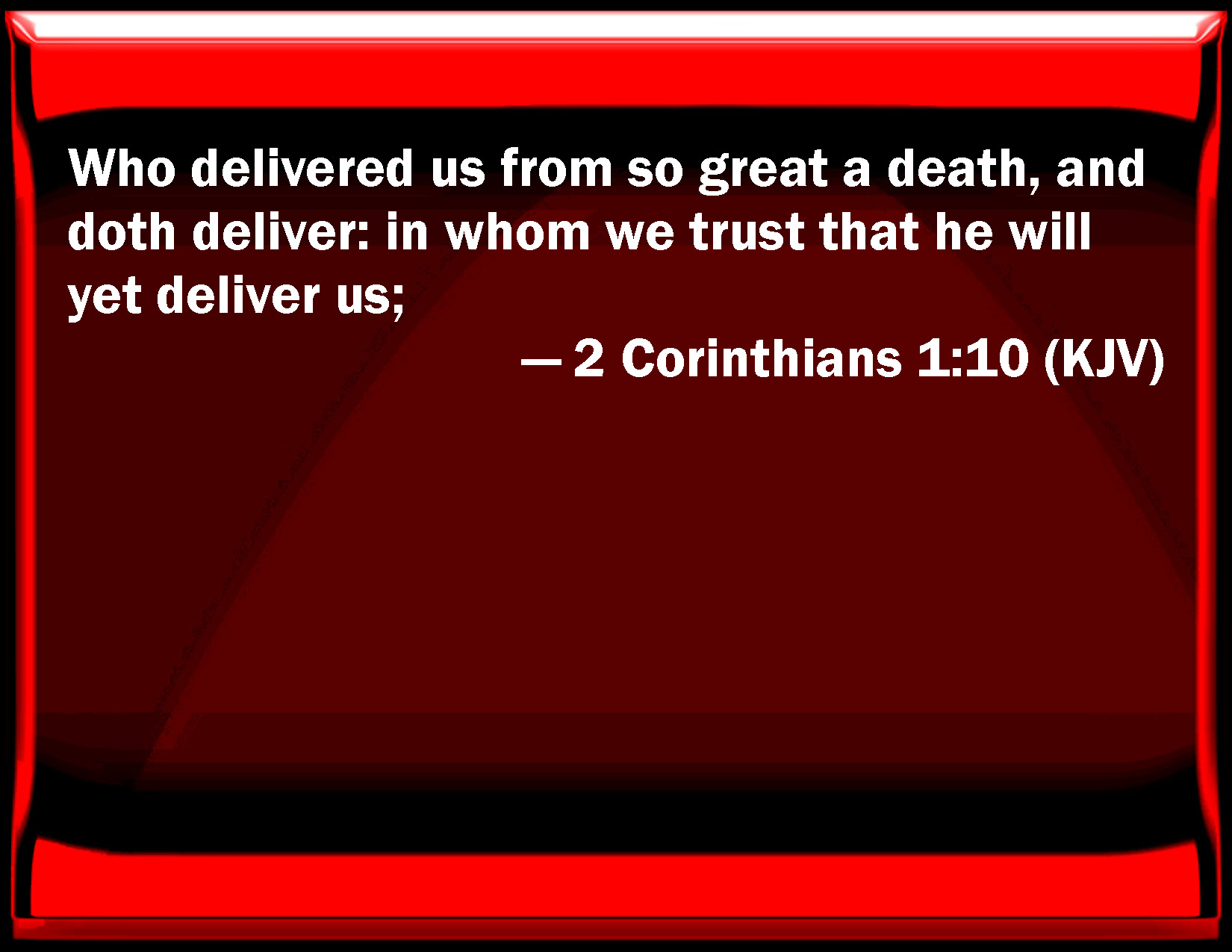 2 Corinthians 1:10 Who delivered us from so great a death, and does deliver: in whom we trust that he will yet deliver us;