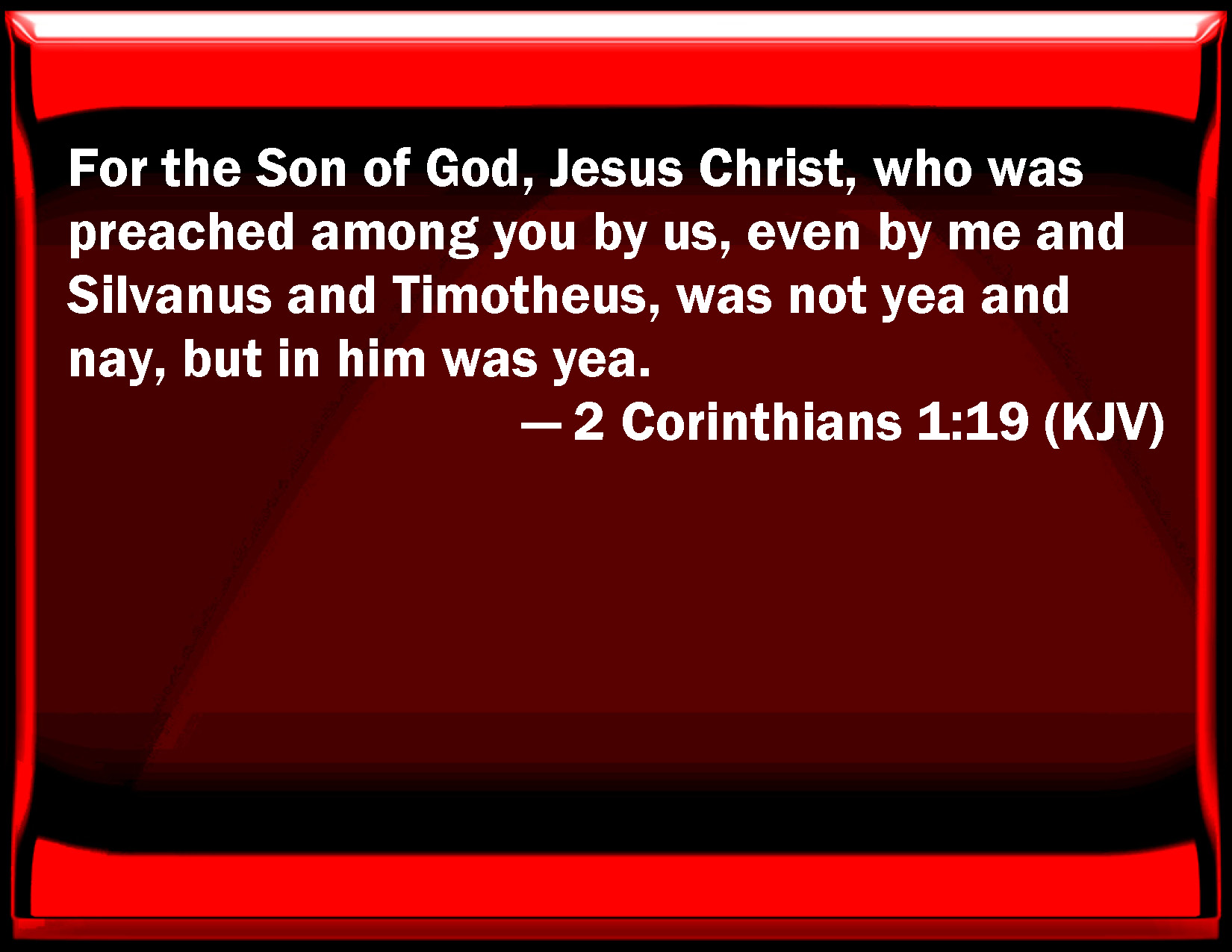 Bible Verse Slide 2 Corinthians 1:19 For the Son of God, Jesus Christ, who was preached among you by us, even by me and Silvanus and Timotheus, was not yes and no, but in him was yes. KJV: For the Son of God, Jesus Christ, who was preached among you by us, even by me and Silvanus and Timotheus, was not yea and nay, but in him was yea. DRB: For the Son of God, Jesus Christ who was preached among you by us, by me, and Sylvanus, and Timothy, was not, It is and It is not, but, It is, was in him. DBT: For the Son of God, Jesus Christ, he who has been preached by us among you (by me and Silvanus and Timotheus), did not become yea and nay, but yea is in him. ERV: For the Son of God, Jesus Christ, who was preached among you by us, even by me and Silvanus and Timothy, was not yea and nay, but in him is yea. WBT: For the Son of God, Jesus Christ, who was preached among you by us, even by me, and Silvanus, and Timothy, was not yea and nay, but in him was yea. WEB: For the Son of God, Jesus Christ, who was preached among you by us, by me, Silvanus, and Timothy, was not "Yes and no," but in him is "Yes." YLT: for the Son of God, Jesus Christ, among you through us having been preached — through me and Silvanus and Timotheus — did not become Yes and No, but in him it hath become Yes;Links 2 Corinthians 1:19 NIV • 2 Corinthians 1:19 NLT • 2 Corinthians 1:19 ESV • 2 Corinthians 1:19 NASB • 2 Corinthians 1:19 KJV • 2 Corinthians 1:19 Interlinear • 2 Corinthians 1:19 Commentaries • 2 Corinthians 1:19 Parallel Texts • 2 Corinthians 1:19 Bible Apps • 2 Corinthians 1:19 Parallel • Bible Hub |