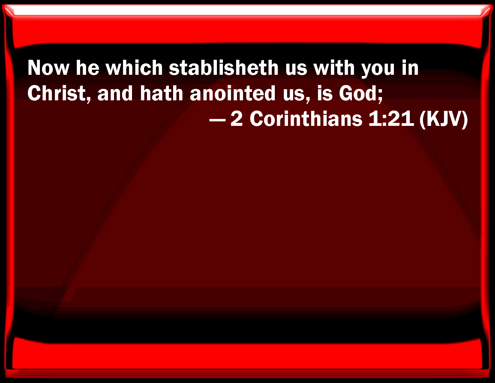 Bible Verse Slide 2 Corinthians 1:21 Now he which establishes us with you in Christ, and has anointed us, is God; KJV: Now he which stablisheth us with you in Christ, and hath anointed us, is God; DRB: Now he that confirmeth us with you in Christ, and that hath anointed us, is God: DBT: Now he that establishes us with you in Christ, and has anointed us, is God, ERV: Now he that stablisheth us with you in Christ, and anointed us, is God; WBT: Now he who establisheth us with you in Christ, and hath anointed us, is God; WEB: Now he who establishes us with you in Christ, and anointed us, is God; YLT: and He who is confirming you with us into Christ, and did anoint us, is God,Links 2 Corinthians 1:21 NIV • 2 Corinthians 1:21 NLT • 2 Corinthians 1:21 ESV • 2 Corinthians 1:21 NASB • 2 Corinthians 1:21 KJV • 2 Corinthians 1:21 Interlinear • 2 Corinthians 1:21 Commentaries • 2 Corinthians 1:21 Parallel Texts • 2 Corinthians 1:21 Bible Apps • 2 Corinthians 1:21 Parallel • Bible Hub |
