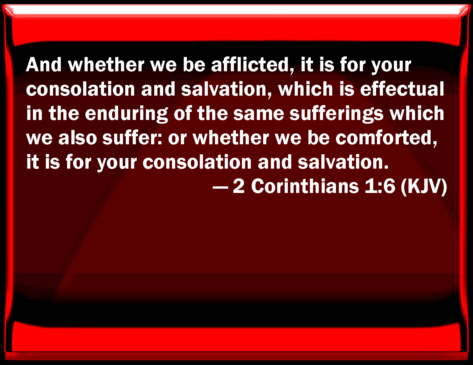Bible Verse Slide 2 Corinthians 1:6 And whether we be afflicted, it is for your consolation and salvation, which is effectual in the enduring of the same sufferings which we also suffer: or whether we be comforted, it is for your consolation and salvation. KJV: And whether we be afflicted, it is for your consolation and salvation, which is effectual in the enduring of the same sufferings which we also suffer: or whether we be comforted, it is for your consolation and salvation. DRB: Now whether we be in tribulation, it is for your exhortation and salvation: or whether we be comforted, it is for your consolation: or whether we be exhorted, it is for your exhortation and salvation, which worketh the enduring of the same sufferings which we also suffer. DBT: But whether we are in tribulation, it is for your encouragement and salvation, wrought in the endurance of the same sufferings which we also suffer, ERV: But whether we be afflicted, it is for your comfort and salvation; or whether we be comforted, it is for your comfort, which worketh in the patient enduring of the same sufferings which we also suffer: WBT: And whether we are afflicted, it is for your consolation and salvation, which is effectual in the enduring of the same sufferings which we also suffer: or whether we are comforted, it is for your consolation and salvation. WEB: But if we are afflicted, it is for your comfort and salvation. If we are comforted, it is for your comfort, which produces in you the patient enduring of the same sufferings which we also suffer. YLT: and whether we be in tribulation, it is for your comfort and salvation, that is wrought in the enduring of the same sufferings that we also suffer; whether we are comforted, it is for your comfort and salvation;Links 2 Corinthians 1:6 NIV • 2 Corinthians 1:6 NLT • 2 Corinthians 1:6 ESV • 2 Corinthians 1:6 NASB • 2 Corinthians 1:6 KJV • 2 Corinthians 1:6 Interlinear • 2 Corinthians 1:6 Commentaries • 2 Corinthians 1:6 Parallel Texts • 2 Corinthians 1:6 Bible Apps • 2 Corinthians 1:6 Parallel • Bible Hub |