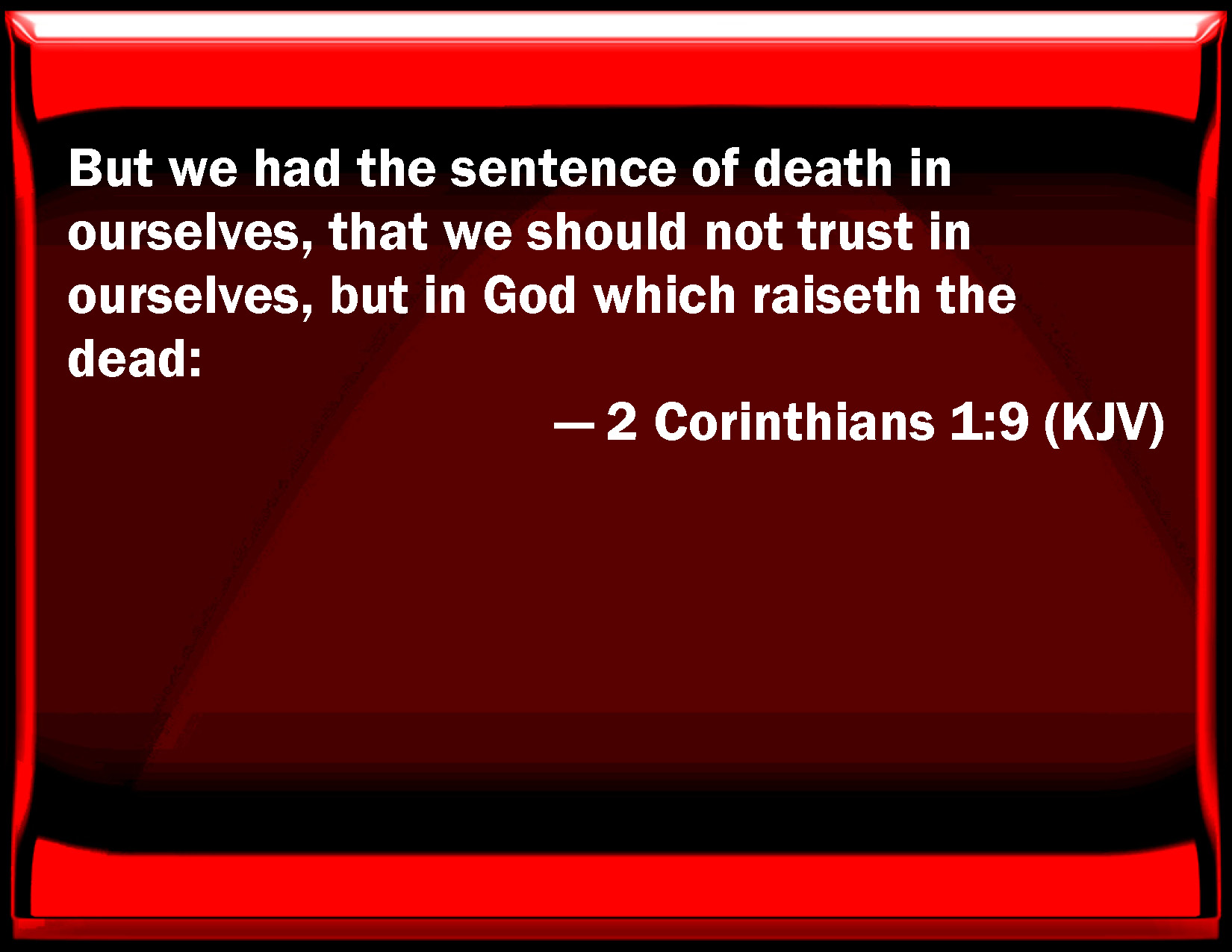 Bible Verse Slide 2 Corinthians 1:9 But we had the sentence of death in ourselves, that we should not trust in ourselves, but in God which raises the dead: KJV: But we had the sentence of death in ourselves, that we should not trust in ourselves, but in God which raiseth the dead: DRB: But we had in ourselves the answer of death, that we should not trust in ourselves, but in God who raiseth the dead. DBT: But we ourselves had the sentence of death in ourselves, that we should not have our trust in ourselves, but in God who raises the dead; ERV: yea, we ourselves have had the answer of death within ourselves, that we should not trust in ourselves, but in God which raiseth the dead: WBT: But we had the sentence of death in ourselves, that we should not trust in ourselves, but in God who raiseth the dead: WEB: Yes, we ourselves have had the sentence of death within ourselves, that we should not trust in ourselves, but in God who raises the dead, YLT: but we ourselves in ourselves the sentence of the death have had, that we may not be trusting on ourselves, but on God, who is raising the dead,Links 2 Corinthians 1:9 NIV • 2 Corinthians 1:9 NLT • 2 Corinthians 1:9 ESV • 2 Corinthians 1:9 NASB • 2 Corinthians 1:9 KJV • 2 Corinthians 1:9 Interlinear • 2 Corinthians 1:9 Commentaries • 2 Corinthians 1:9 Parallel Texts • 2 Corinthians 1:9 Bible Apps • 2 Corinthians 1:9 Parallel • Bible Hub |