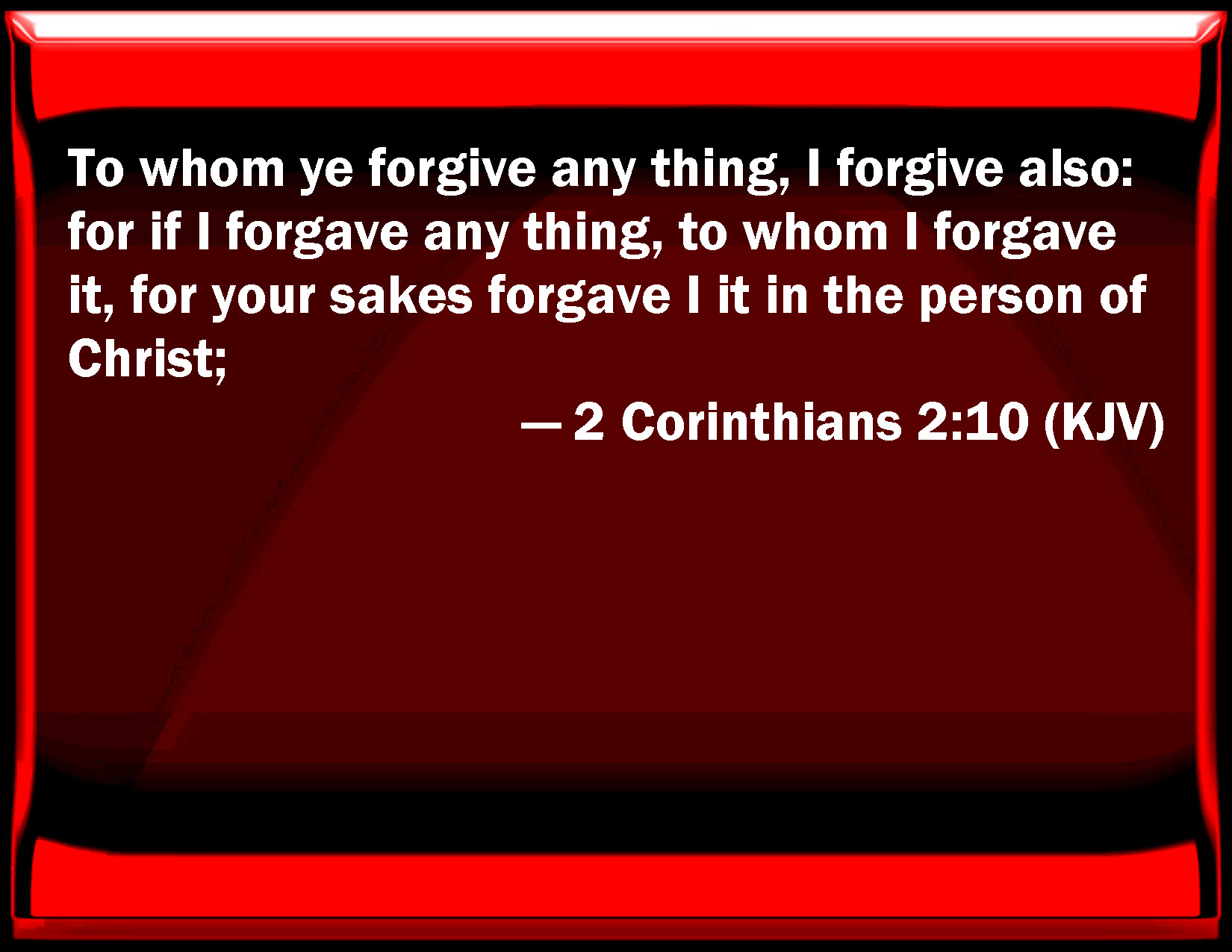 2 Corinthians 2:10 To whom you forgive any thing, I forgive also: for if I forgave any thing, to whom I forgave it, for your sakes forgave I it in the person of Christ;