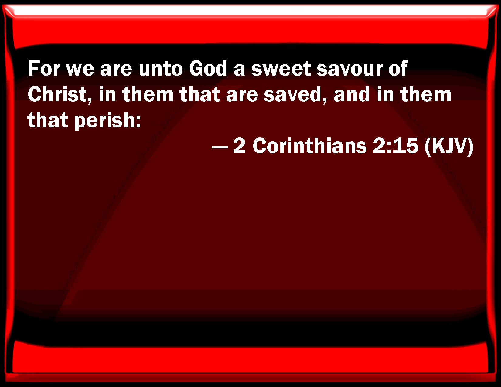 Bible Verse Slide 2 Corinthians 2:15 For we are to God a sweet smell of Christ, in them that are saved, and in them that perish: KJV: For we are unto God a sweet savour of Christ, in them that are saved, and in them that perish: DRB: For we are the good odour of Christ unto God, in them that are saved, and in them that perish. DBT: For we are a sweet odour of Christ to God, in the saved and in those that perish: ERV: For we are a sweet savour of Christ unto God, in them that are being saved, and in them that are perishing; WBT: For we are to God a sweet savor of Christ, in them that are saved, and in them that perish: WEB: For we are a sweet aroma of Christ to God, in those who are saved, and in those who perish; YLT: because of Christ a sweet fragrance we are to God, in those being saved, and in those being lost;Links 2 Corinthians 2:15 NIV • 2 Corinthians 2:15 NLT • 2 Corinthians 2:15 ESV • 2 Corinthians 2:15 NASB • 2 Corinthians 2:15 KJV • 2 Corinthians 2:15 Interlinear • 2 Corinthians 2:15 Commentaries • 2 Corinthians 2:15 Parallel Texts • 2 Corinthians 2:15 Bible Apps • 2 Corinthians 2:15 Parallel • Bible Hub |