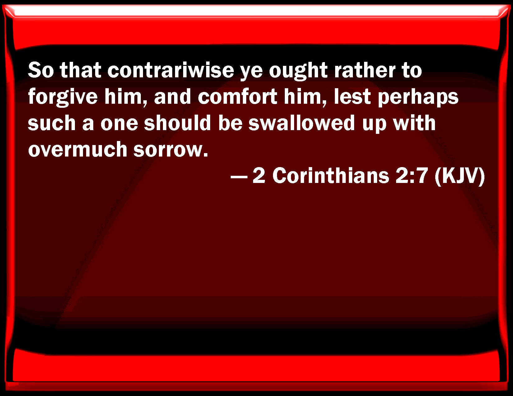 Bible Verse Slide 2 Corinthians 2:7 So that contrariwise you ought rather to forgive him, and comfort him, lest perhaps such a one should be swallowed up with overmuch sorrow. KJV: So that contrariwise ye ought rather to forgive him, and comfort him, lest perhaps such a one should be swallowed up with overmuch sorrow. DRB: So that on the contrary, you should rather forgive him and comfort him, lest perhaps such a one be swallowed up with overmuch sorrow. DBT: so that on the contrary ye should rather shew grace and encourage, lest perhaps such a one should be swallowed up with excessive grief. ERV: so that contrariwise ye should rather forgive him and comfort him, lest by any means such a one should be swallowed up with his overmuch sorrow. WBT: So that on the other hand, ye ought rather to forgive him, and comfort him, lest perhaps such one should be swallowed up with excessive sorrow. WEB: so that on the contrary you should rather forgive him and comfort him, lest by any means such a one should be swallowed up with his excessive sorrow. YLT: so that, on the contrary, it is rather for you to forgive and to comfort, lest by over abundant sorrow such a one may be swallowed up;Links 2 Corinthians 2:7 NIV • 2 Corinthians 2:7 NLT • 2 Corinthians 2:7 ESV • 2 Corinthians 2:7 NASB • 2 Corinthians 2:7 KJV • 2 Corinthians 2:7 Interlinear • 2 Corinthians 2:7 Commentaries • 2 Corinthians 2:7 Parallel Texts • 2 Corinthians 2:7 Bible Apps • 2 Corinthians 2:7 Parallel • Bible Hub |