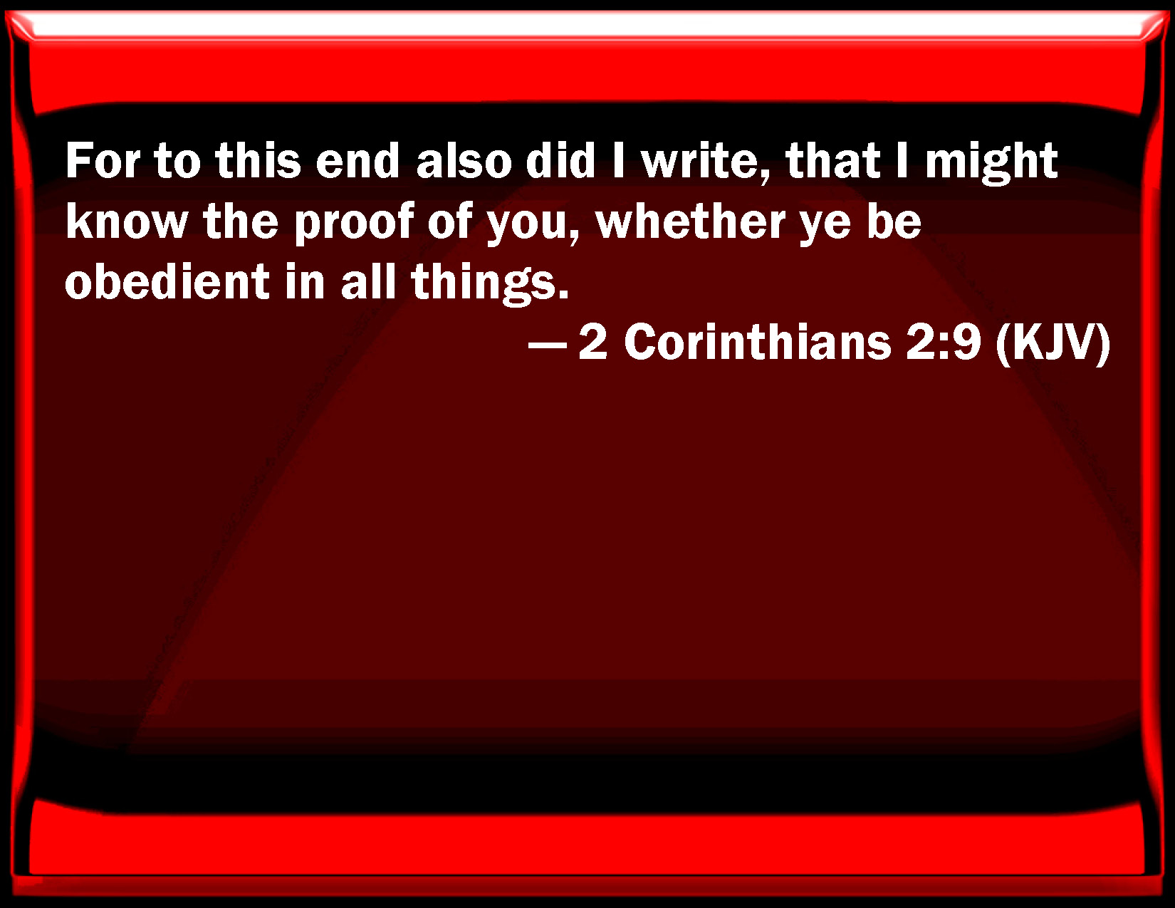 Bible Verse Slide 2 Corinthians 2:9 For to this end also did I write, that I might know the proof of you, whether you be obedient in all things. KJV: For to this end also did I write, that I might know the proof of you, whether ye be obedient in all things. DRB: For to this end also did I write, that I may know the experiment of you, whether you be obedient in all things. DBT: For to this end also I have written, that I might know, by putting you to the test, if as to everything ye are obedient. ERV: For to this end also did I write, that I might know the proof of you, whether ye are obedient in all things. WBT: For to this end also I wrote, that I might know the proof of you, whether ye are obedient in all things. WEB: For to this end I also wrote, that I might know the proof of you, whether you are obedient in all things. YLT: for, for this also did I write, that I might know the proof of you, whether in regard to all things ye are obedient.Links 2 Corinthians 2:9 NIV • 2 Corinthians 2:9 NLT • 2 Corinthians 2:9 ESV • 2 Corinthians 2:9 NASB • 2 Corinthians 2:9 KJV • 2 Corinthians 2:9 Interlinear • 2 Corinthians 2:9 Commentaries • 2 Corinthians 2:9 Parallel Texts • 2 Corinthians 2:9 Bible Apps • 2 Corinthians 2:9 Parallel • Bible Hub |