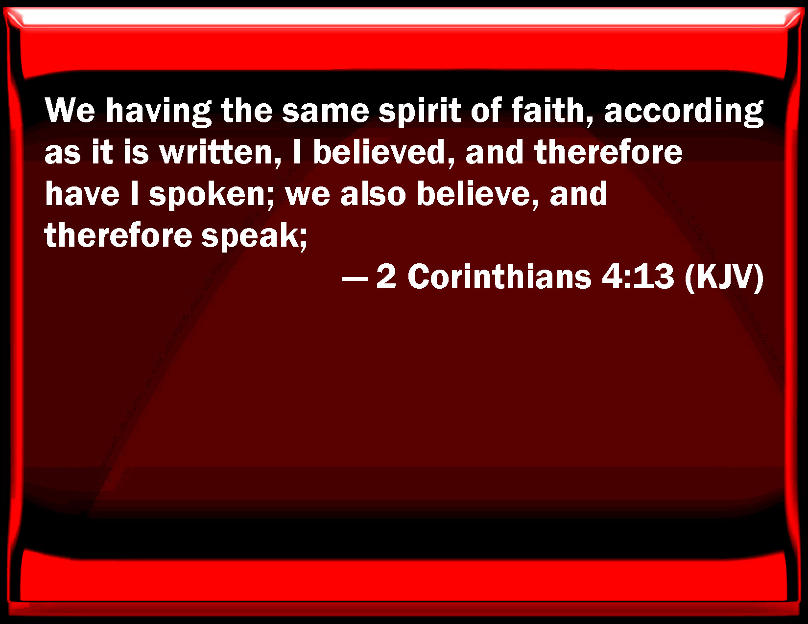 Bible Verse Slide 2 Corinthians 4:13 We having the same spirit of faith, according as it is written, I believed, and therefore have I spoken; we also believe, and therefore speak; KJV: We having the same spirit of faith, according as it is written, I believed, and therefore have I spoken; we also believe, and therefore speak; DRB: But having the same spirit of faith, as it is written: I believed, for which cause I have spoken; we also believe, for which cause we speak also: DBT: And having the same spirit of faith, according to what is written, I have believed, therefore have I spoken; we also believe, therefore also we speak; ERV: But having the same spirit of faith, according to that which is written, I believed, and therefore did I speak; we also believe, and therefore also we speak; WBT: We having the same spirit of faith, according as it is written, I believed, and therefore have I spoken; we also believe, and therefore speak; WEB: But having the same spirit of faith, according to that which is written, "I believed, and therefore I spoke." We also believe, and therefore also we speak; YLT: And having the same spirit of the faith, according to that which hath been written, 'I believed, therefore I did speak;' we also do believe, therefore also do we speak;Links 2 Corinthians 4:13 NIV • 2 Corinthians 4:13 NLT • 2 Corinthians 4:13 ESV • 2 Corinthians 4:13 NASB • 2 Corinthians 4:13 KJV • 2 Corinthians 4:13 Interlinear • 2 Corinthians 4:13 Commentaries • 2 Corinthians 4:13 Parallel Texts • 2 Corinthians 4:13 Bible Apps • 2 Corinthians 4:13 Parallel • Bible Hub |