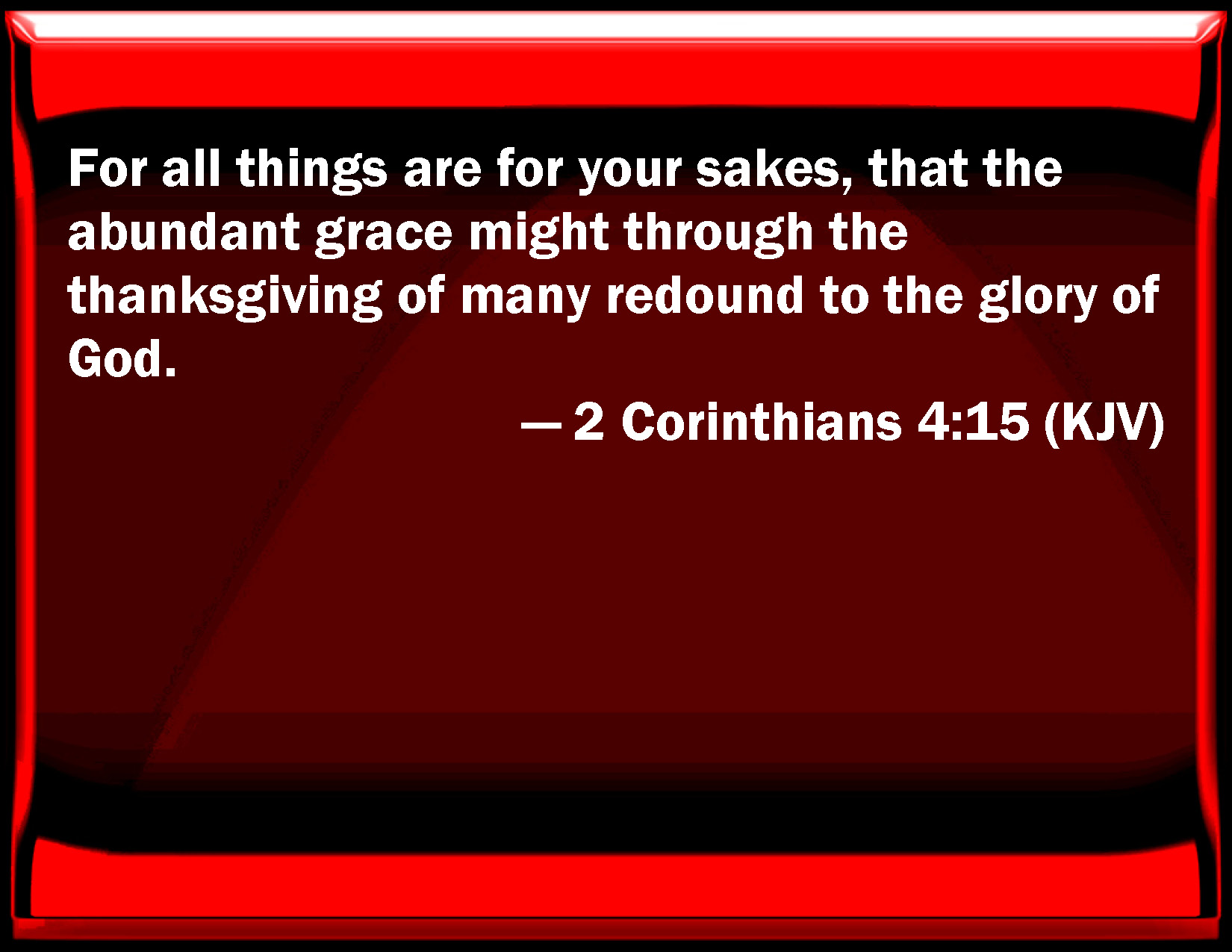 Bible Verse Slide 2 Corinthians 4:15 For all things are for your sakes, that the abundant grace might through the thanksgiving of many redound to the glory of God. KJV: For all things are for your sakes, that the abundant grace might through the thanksgiving of many redound to the glory of God. DRB: For all things are for your sakes; that the grace abounding through many, may abound in thanksgiving unto the glory of God. DBT: For all things are for your sakes, that the grace abounding through the many may cause thanksgiving to abound to the glory of God. ERV: For all things are for your sakes, that the grace, being multiplied through the many, may cause the thanksgiving to abound unto the glory of God. WBT: For all things are for your sakes, that the abundant grace may, through the thanksgiving of many, redound to the glory of God. WEB: For all things are for your sakes, that the grace, being multiplied through the many, may cause the thanksgiving to abound to the glory of God. YLT: for the all things are because of you, that the grace having been multiplied, because of the thanksgiving of the more, may abound to the glory of God;Links 2 Corinthians 4:15 NIV • 2 Corinthians 4:15 NLT • 2 Corinthians 4:15 ESV • 2 Corinthians 4:15 NASB • 2 Corinthians 4:15 KJV • 2 Corinthians 4:15 Interlinear • 2 Corinthians 4:15 Commentaries • 2 Corinthians 4:15 Parallel Texts • 2 Corinthians 4:15 Bible Apps • 2 Corinthians 4:15 Parallel • Bible Hub |