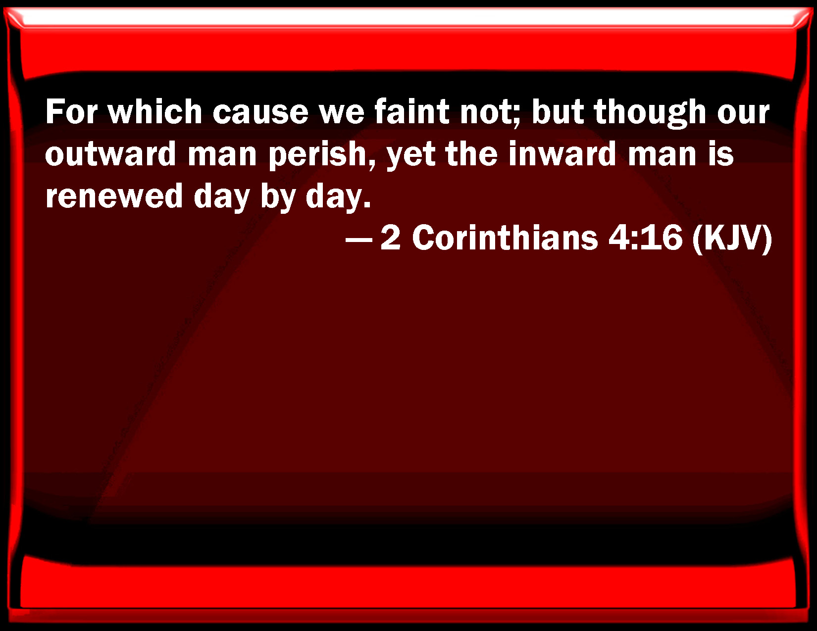 Bible Verse Slide 2 Corinthians 4:16 For which cause we faint not; but though our outward man perish, yet the inward man is renewed day by day. KJV: For which cause we faint not; but though our outward man perish, yet the inward man is renewed day by day. DRB: For which cause we faint not; but though our outward man is corrupted, yet the inward man is renewed day by day. DBT: Wherefore we faint not; but if indeed our outward man is consumed, yet the inward is renewed day by day. ERV: Wherefore we faint not; but though our outward man is decaying, yet our inward man is renewed day by day. WBT: For which cause we faint not; but though our outward man is wasted, yet the inward man is renewed day by day. WEB: Therefore we don't faint, but though our outward man is decaying, yet our inward man is renewed day by day. YLT: wherefore, we faint not, but if also our outward man doth decay, yet the inward is renewed day by day;Links 2 Corinthians 4:16 NIV • 2 Corinthians 4:16 NLT • 2 Corinthians 4:16 ESV • 2 Corinthians 4:16 NASB • 2 Corinthians 4:16 KJV • 2 Corinthians 4:16 Interlinear • 2 Corinthians 4:16 Commentaries • 2 Corinthians 4:16 Parallel Texts • 2 Corinthians 4:16 Bible Apps • 2 Corinthians 4:16 Parallel • Bible Hub |