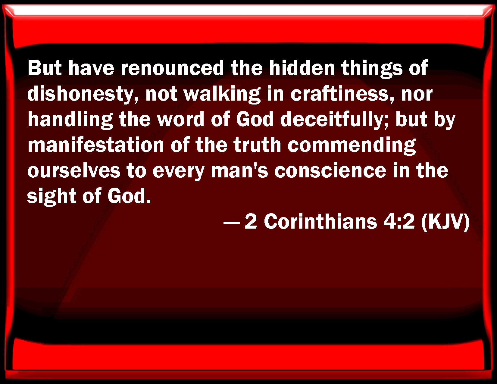 Bible Verse Slide 2 Corinthians 4:2 But have renounced the hidden things of dishonesty, not walking in craftiness, nor handling the word of God deceitfully; but by manifestation of the truth commending ourselves to every man's conscience in the sight of God. KJV: But have renounced the hidden things of dishonesty, not walking in craftiness, nor handling the word of God deceitfully; but by manifestation of the truth commending ourselves to every man's conscience in the sight of God. DRB: But we renounce the hidden things of dishonesty, not walking in craftiness, nor adulterating the word of God; but by manifestation of the truth commending ourselves to every man's conscience, in the sight of God. DBT: But we have rejected the hidden things of shame, not walking in deceit, nor falsifying the word of God, but by manifestation of the truth commending ourselves to every conscience of men before God. ERV: but we have renounced the hidden things of shame, not walking in craftiness, nor handling the word of God deceitfully; but by the manifestation of the truth commending ourselves to every man's conscience in the sight of God. WBT: But have renounced the hidden things of dishonesty; not walking in craftiness, nor handling the word of God deceitfully; but, by manifestation of the truth, commending ourselves to every man's conscience in the sight of God. WEB: But we have renounced the hidden things of shame, not walking in craftiness, nor handling the word of God deceitfully; but by the manifestation of the truth commending ourselves to every man's conscience in the sight of God. YLT: but did renounce for ourselves the hidden things of shame, not walking in craftiness, nor deceitfully using the word of God, but by the manifestation of the truth recommending ourselves unto every conscience of men, before God;Links 2 Corinthians 4:2 NIV • 2 Corinthians 4:2 NLT • 2 Corinthians 4:2 ESV • 2 Corinthians 4:2 NASB • 2 Corinthians 4:2 KJV • 2 Corinthians 4:2 Interlinear • 2 Corinthians 4:2 Commentaries • 2 Corinthians 4:2 Parallel Texts • 2 Corinthians 4:2 Bible Apps • 2 Corinthians 4:2 Parallel • Bible Hub |