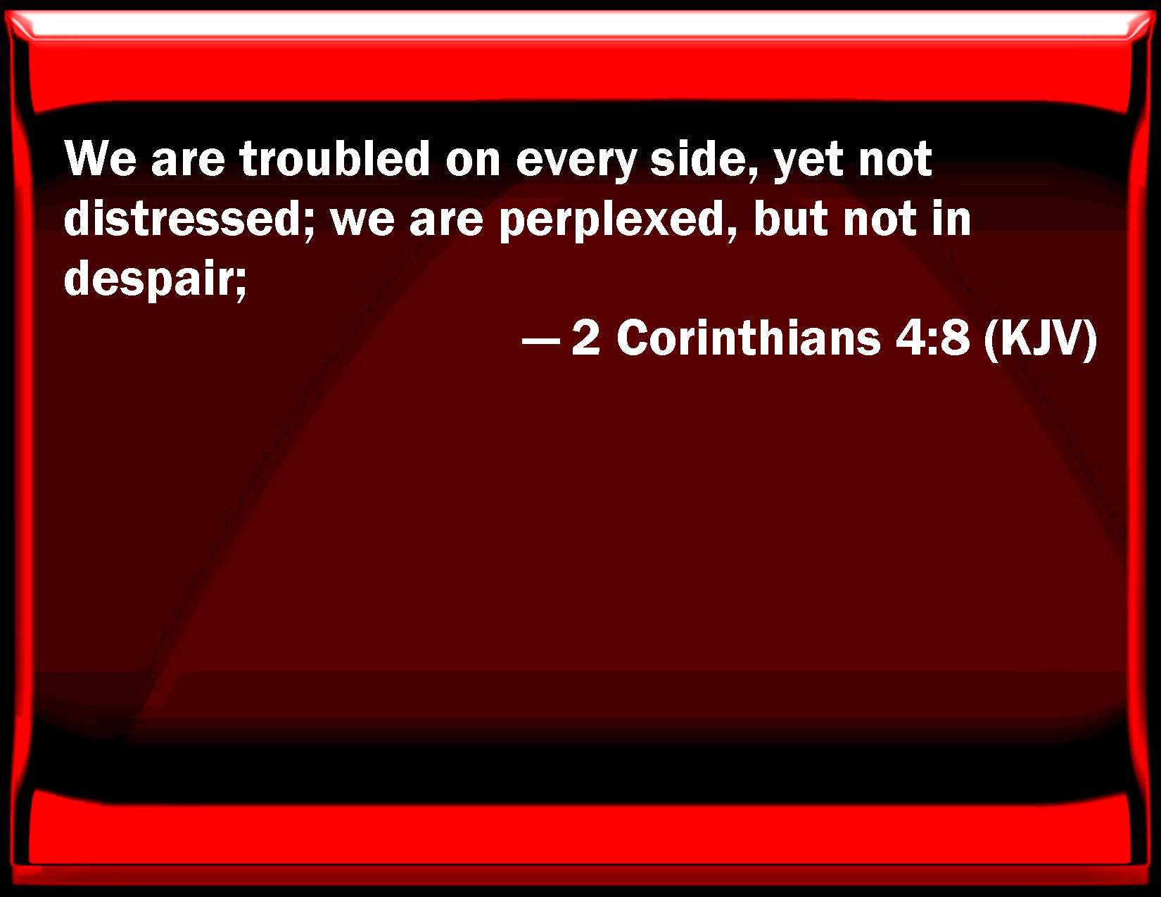 Bible Verse Slide 2 Corinthians 4:8 We are troubled on every side, yet not distressed; we are perplexed, but not in despair; KJV: We are troubled on every side, yet not distressed; we are perplexed, but not in despair; DRB: In all things we suffer tribulation, but are not distressed; we are straitened, but are not destitute; DBT: every way afflicted, but not straitened; seeing no apparent issue, but our way not entirely shut up; ERV: we are pressed on every side, yet not straitened; perplexed, yet not unto despair; WBT: We are troubled on every side, yet not distressed; we are perplexed, but not in despair; WEB: We are pressed on every side, yet not crushed; perplexed, yet not to despair; YLT: on every side being in tribulation, but not straitened; perplexed, but not in despair;Links 2 Corinthians 4:8 NIV • 2 Corinthians 4:8 NLT • 2 Corinthians 4:8 ESV • 2 Corinthians 4:8 NASB • 2 Corinthians 4:8 KJV • 2 Corinthians 4:8 Interlinear • 2 Corinthians 4:8 Commentaries • 2 Corinthians 4:8 Parallel Texts • 2 Corinthians 4:8 Bible Apps • 2 Corinthians 4:8 Parallel • Bible Hub |