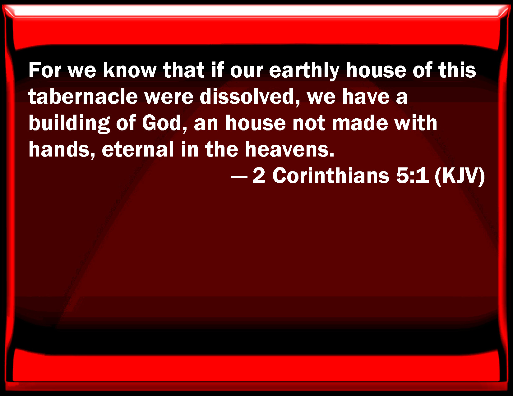 Bible Verse Slide 2 Corinthians 5:1 For we know that if our earthly house of this tabernacle were dissolved, we have a building of God, an house not made with hands, eternal in the heavens. KJV: For we know that if our earthly house of this tabernacle were dissolved, we have a building of God, an house not made with hands, eternal in the heavens. DRB: For we know, if our earthly house of this habitation be dissolved, that we have a building of God, a house not made with hands, eternal in heaven. DBT: For we know that if our earthly tabernacle house be destroyed, we have a building from God, a house not made with hands, eternal in the heavens. ERV: For we know that if the earthly house of our tabernacle be dissolved, we have a building from God, a house not made with hands, eternal, in the heavens. WBT: For we know that if our earthly house of this tabernacle were dissolved, we have a building of God, a house not made with hands, eternal in the heavens. WEB: For we know that if the earthly house of our tent is dissolved, we have a building from God, a house not made with hands, eternal, in the heavens. YLT: For we have known that if our earthly house of the tabernacle may be thrown down, a building from God we have, an house not made with hands — age-during — in the heavens,Links 2 Corinthians 5:1 NIV • 2 Corinthians 5:1 NLT • 2 Corinthians 5:1 ESV • 2 Corinthians 5:1 NASB • 2 Corinthians 5:1 KJV • 2 Corinthians 5:1 Interlinear • 2 Corinthians 5:1 Commentaries • 2 Corinthians 5:1 Parallel Texts • 2 Corinthians 5:1 Bible Apps • 2 Corinthians 5:1 Parallel • Bible Hub |