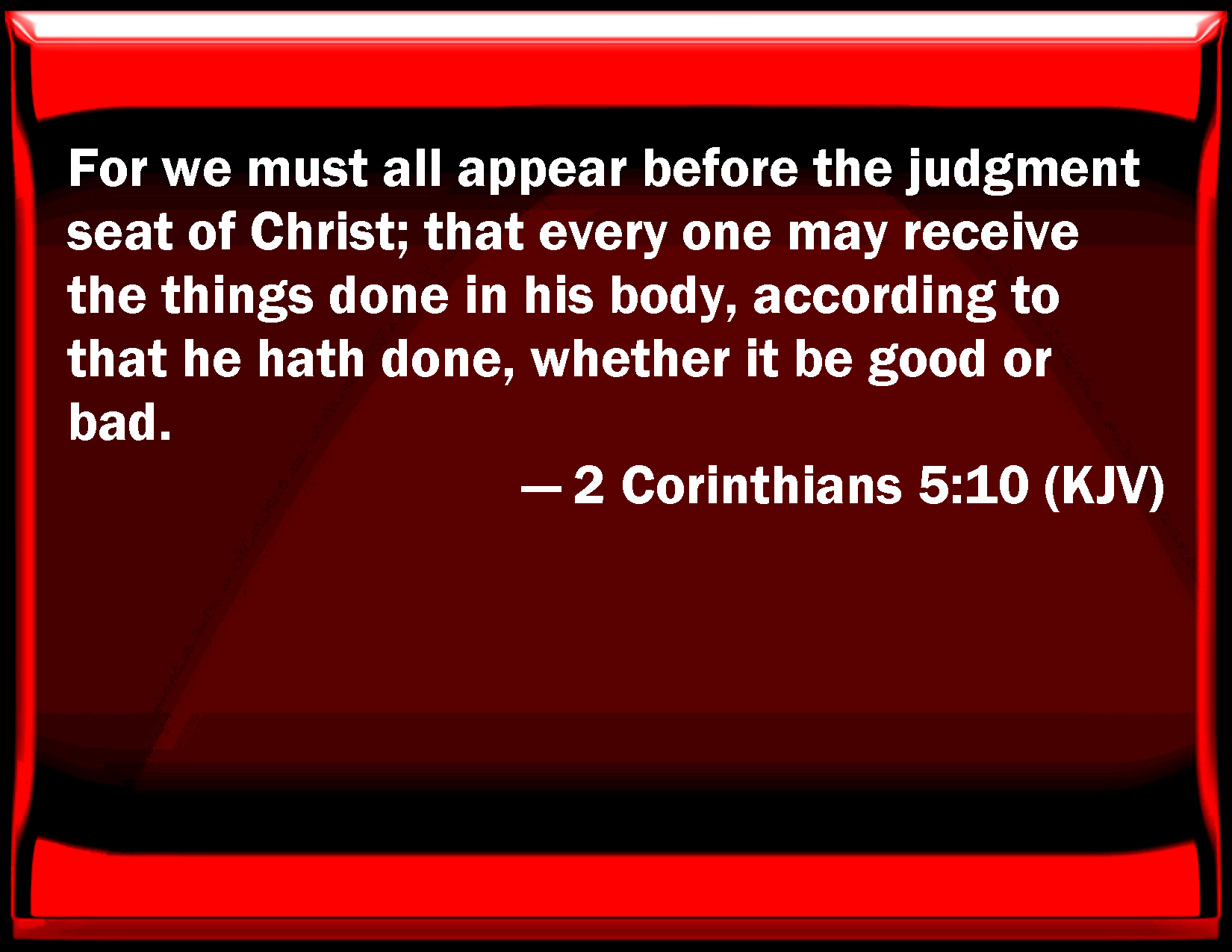 Bible Verse Slide 2 Corinthians 5:10 For we must all appear before the judgment seat of Christ; that every one may receive the things done in his body, according to that he has done, whether it be good or bad. KJV: For we must all appear before the judgment seat of Christ; that every one may receive the things done in his body, according to that he hath done, whether it be good or bad. DRB: For we must all be manifested before the judgement seat of Christ, that every one may receive the proper things of the body, according as he hath done, whether it be good or evil. DBT: For we must all be manifested before the judgment-seat of the Christ, that each may receive the things done in the body, according to those he has done, whether it be good or evil. ERV: For we must all be made manifest before the judgment-seat of Christ; that each one may receive the things done in the body, according to what he hath done, whether it be good or bad. WBT: For we must all appear before the judgment-seat of Christ; that every one may receive the things done in his body, according to what he hath done, whether good or bad. WEB: For we must all be revealed before the judgment seat of Christ; that each one may receive the things in the body, according to what he has done, whether good or bad. YLT: for all of us it behoveth to be manifested before the tribunal of the Christ, that each one may receive the things done through the body, in reference to the things that he did, whether good or evil;Links 2 Corinthians 5:10 NIV • 2 Corinthians 5:10 NLT • 2 Corinthians 5:10 ESV • 2 Corinthians 5:10 NASB • 2 Corinthians 5:10 KJV • 2 Corinthians 5:10 Interlinear • 2 Corinthians 5:10 Commentaries • 2 Corinthians 5:10 Parallel Texts • 2 Corinthians 5:10 Bible Apps • 2 Corinthians 5:10 Parallel • Bible Hub |