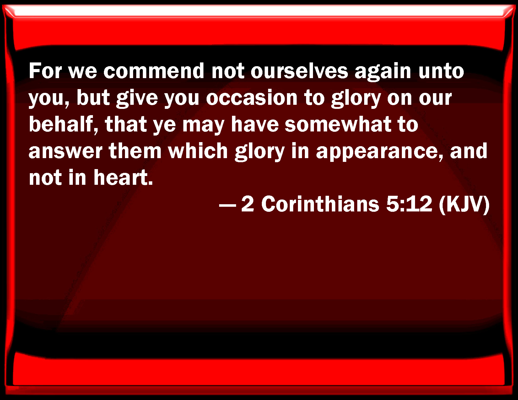 Bible Verse Slide 2 Corinthians 5:12 For we commend not ourselves again to you, but give you occasion to glory on our behalf, that you may have somewhat to answer them which glory in appearance, and not in heart. KJV: For we commend not ourselves again unto you, but give you occasion to glory on our behalf, that ye may have somewhat to answer them which glory in appearance, and not in heart. DRB: We commend not ourselves again to you, but give you occasion to glory in our behalf; that you may have somewhat to answer them who glory in face, and not in heart. DBT: For we do not again commend ourselves to you, but we are giving to you occasion of boast in our behalf, that ye may have such with those boasting in countenance, and not in heart. ERV: We are not again commending ourselves unto you, but speak as giving you occasion of glorying on our behalf, that ye may have wherewith to answer them that glory in appearance, and not in heart. WBT: For we commend not ourselves again to you, but give you occasion to glory on our behalf, that ye may have somewhat to answer them who glory in appearance, and not in heart. WEB: For we are not commending ourselves to you again, but speak as giving you occasion of boasting on our behalf, that you may have something to answer those who boast in appearance, and not in heart. YLT: for not again ourselves do we recommend to you, but we are giving occasion to you of glorifying in our behalf, that ye may have something in reference to those glorifying in face and not in heart;Links 2 Corinthians 5:12 NIV • 2 Corinthians 5:12 NLT • 2 Corinthians 5:12 ESV • 2 Corinthians 5:12 NASB • 2 Corinthians 5:12 KJV • 2 Corinthians 5:12 Interlinear • 2 Corinthians 5:12 Commentaries • 2 Corinthians 5:12 Parallel Texts • 2 Corinthians 5:12 Bible Apps • 2 Corinthians 5:12 Parallel • Bible Hub |