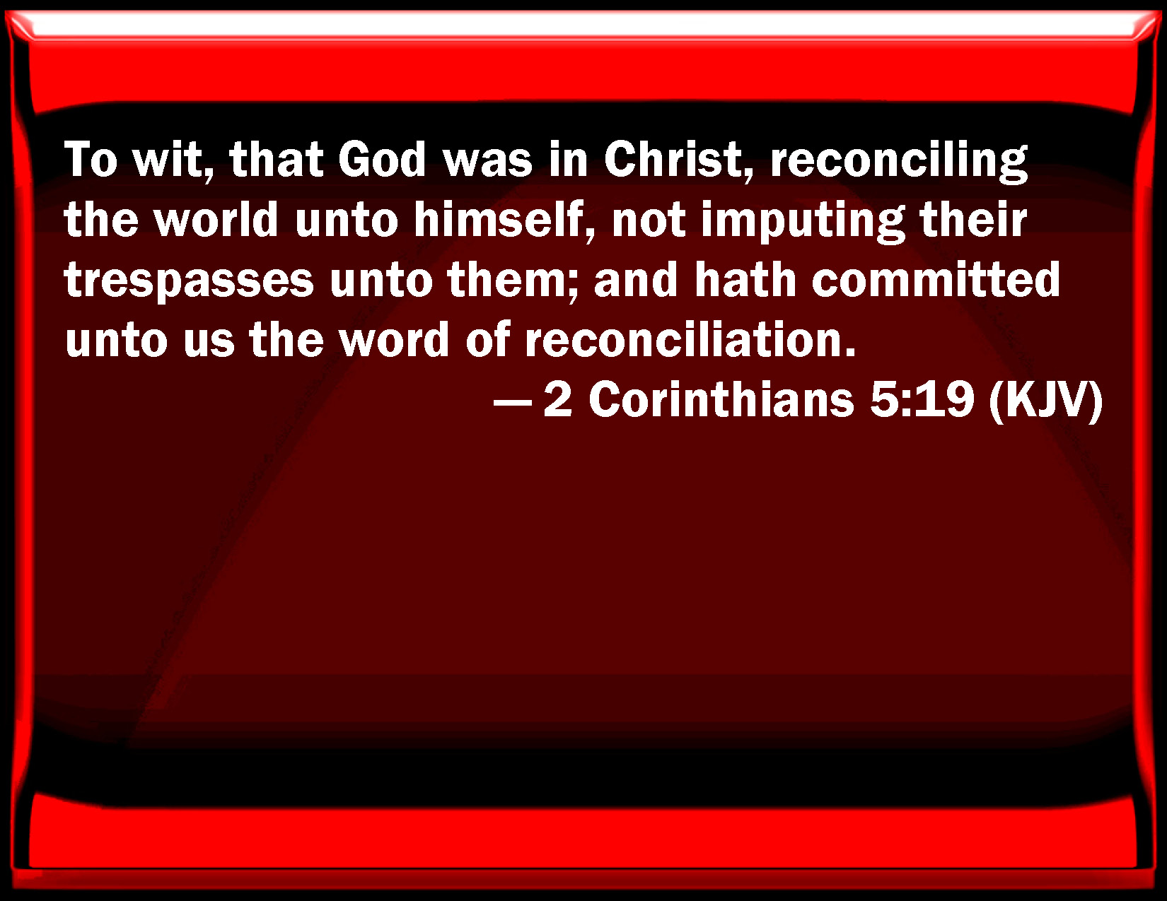 Bible Verse Slide 2 Corinthians 5:19 To wit, that God was in Christ, reconciling the world to himself, not imputing their trespasses to them; and has committed to us the word of reconciliation. KJV: To wit, that God was in Christ, reconciling the world unto himself, not imputing their trespasses unto them; and hath committed unto us the word of reconciliation. DRB: For God indeed was in Christ, reconciling the world to himself, not imputing to them their sins; and he hath placed in us the word of reconciliation. DBT: how that God was in Christ, reconciling the world to himself, not reckoning to them their offences; and putting in us the word of that reconciliation. ERV: to wit, that God was in Christ reconciling the world unto himself, not reckoning unto them their trespasses, and having committed unto us the word of reconciliation. WBT: To wit, that God was in Christ, reconciling the world to himself, not imputing their trespasses to them; and hath committed to us the word of reconciliation. WEB: namely, that God was in Christ reconciling the world to himself, not reckoning to them their trespasses, and having committed to us the word of reconciliation. YLT: how that God was in Christ — a world reconciling to Himself, not reckoning to them their trespasses; and having put in us the word of the reconciliation,Links 2 Corinthians 5:19 NIV • 2 Corinthians 5:19 NLT • 2 Corinthians 5:19 ESV • 2 Corinthians 5:19 NASB • 2 Corinthians 5:19 KJV • 2 Corinthians 5:19 Interlinear • 2 Corinthians 5:19 Commentaries • 2 Corinthians 5:19 Parallel Texts • 2 Corinthians 5:19 Bible Apps • 2 Corinthians 5:19 Parallel • Bible Hub |