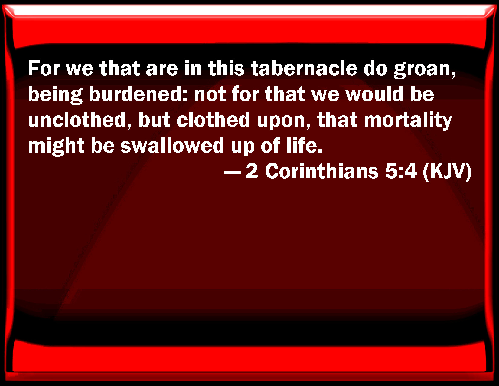 Bible Verse Slide 2 Corinthians 5:4 For we that are in this tabernacle do groan, being burdened: not for that we would be unclothed, but clothed on, that mortality might be swallowed up of life. KJV: For we that are in this tabernacle do groan, being burdened: not for that we would be unclothed, but clothed upon, that mortality might be swallowed up of life. DRB: For we also, who are in this tabernacle, do groan, being burthened; because we would not be unclothed, but clothed upon, that that which is mortal may be swallowed up by life. DBT: For indeed we who are in the tabernacle groan, being burdened; while yet we do not wish to be unclothed, but clothed, that what is mortal may be swallowed up by life. ERV: For indeed we that are in this tabernacle do groan, being burdened; not for that we would be unclothed, but that we would be clothed upon, that what is mortal may be swallowed up of life. WBT: For we that are in this tabernacle do groan, being burdened: not because we would be unclothed, but clothed, that mortality might be swallowed up in life. WEB: For indeed we who are in this tent do groan, being burdened; not that we desire to be unclothed, but that we desire to be clothed, that what is mortal may be swallowed up by life. YLT: for we also who are in the tabernacle do groan, being burdened, seeing we wish not to unclothe ourselves, but to clothe ourselves, that the mortal may be swallowed up of the life.Links 2 Corinthians 5:4 NIV • 2 Corinthians 5:4 NLT • 2 Corinthians 5:4 ESV • 2 Corinthians 5:4 NASB • 2 Corinthians 5:4 KJV • 2 Corinthians 5:4 Interlinear • 2 Corinthians 5:4 Commentaries • 2 Corinthians 5:4 Parallel Texts • 2 Corinthians 5:4 Bible Apps • 2 Corinthians 5:4 Parallel • Bible Hub |
