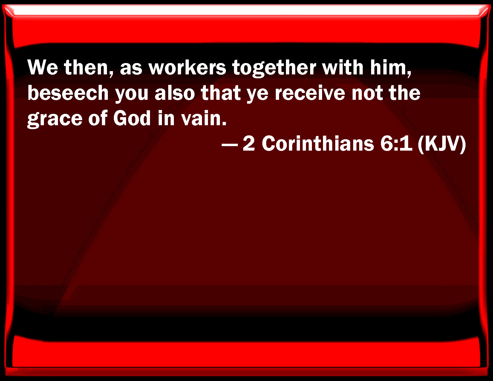 Bible Verse Slide 2 Corinthians 6:1 We then, as workers together with him, beseech you also that you receive not the grace of God in vain. KJV: We then, as workers together with him, beseech you also that ye receive not the grace of God in vain. DRB: And we helping do exhort you, that you receive not the grace of God in vain. DBT: But as fellow-workmen, we also beseech that ye receive not the grace of God in vain: ERV: And working together with him we entreat also that ye receive not the grace of God in vain WBT: We then, as co-workers with him, beseech you also that ye receive not the grace of God in vain. WEB: Working together, we entreat also that you not receive the grace of God in vain, YLT: And working together also we call upon you that ye receive not in vain the grace of God — Links 2 Corinthians 6:1 NIV • 2 Corinthians 6:1 NLT • 2 Corinthians 6:1 ESV • 2 Corinthians 6:1 NASB • 2 Corinthians 6:1 KJV • 2 Corinthians 6:1 Interlinear • 2 Corinthians 6:1 Commentaries • 2 Corinthians 6:1 Parallel Texts • 2 Corinthians 6:1 Bible Apps • 2 Corinthians 6:1 Parallel • Bible Hub |