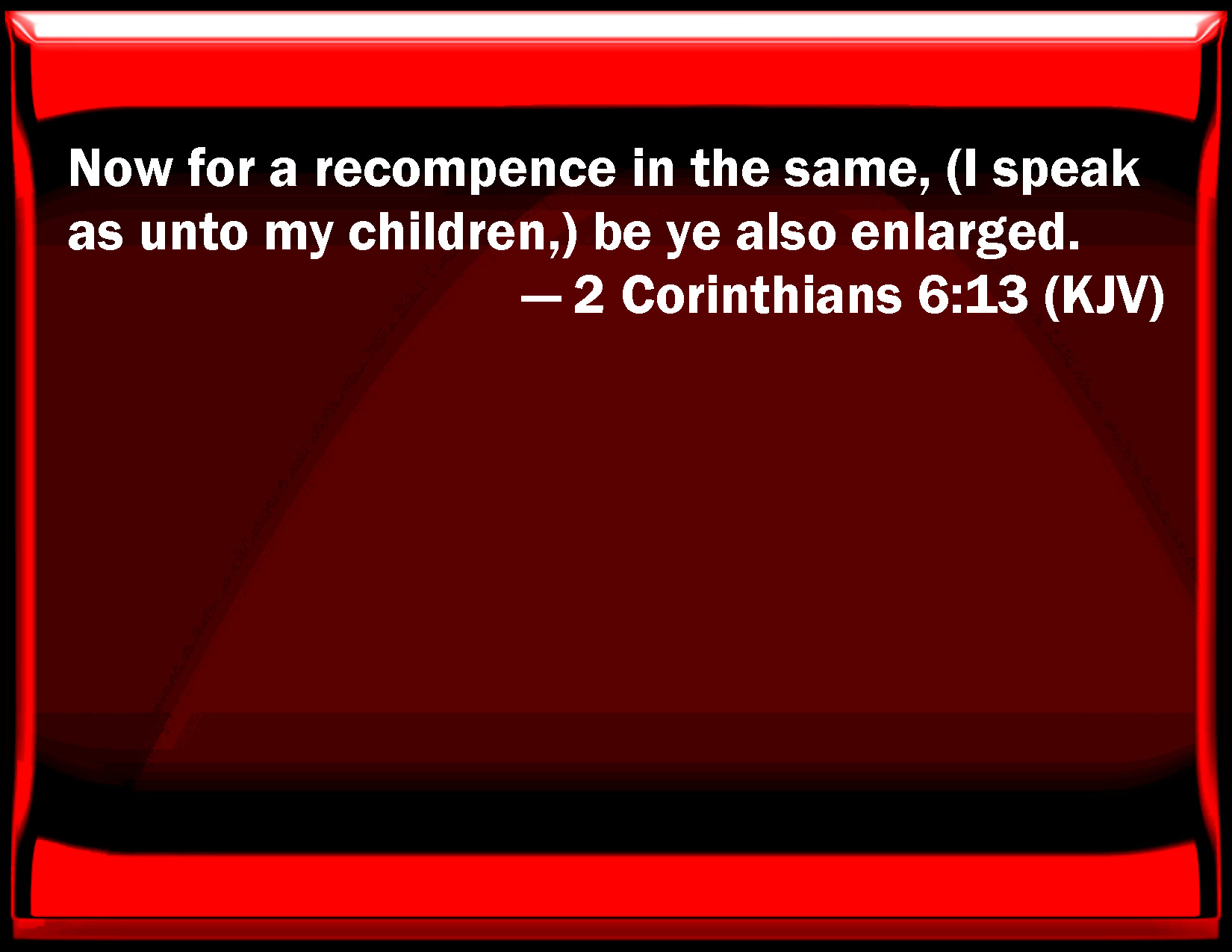 Bible Verse Slide 2 Corinthians 6:13 Now for a recompense in the same, (I speak as to my children,) be you also enlarged. KJV: Now for a recompence in the same, (I speak as unto my children,) be ye also enlarged. DRB: But having the same recompense, (I speak as to my children,) be you also enlarged. DBT: but for an answering recompense, (I speak as to children,) let your heart also expand itself. ERV: Now for a recompense in like kind (I speak as unto my children), be ye also enlarged. WBT: Now for a recompense in the same (I speak as to my children,) be ye also enlarged. WEB: Now in return, I speak as to my children, you also be open wide. YLT: and as a recompense of the same kind, (as to children I say it,) be ye enlarged — also ye!Links 2 Corinthians 6:13 NIV • 2 Corinthians 6:13 NLT • 2 Corinthians 6:13 ESV • 2 Corinthians 6:13 NASB • 2 Corinthians 6:13 KJV • 2 Corinthians 6:13 Interlinear • 2 Corinthians 6:13 Commentaries • 2 Corinthians 6:13 Parallel Texts • 2 Corinthians 6:13 Bible Apps • 2 Corinthians 6:13 Parallel • Bible Hub |