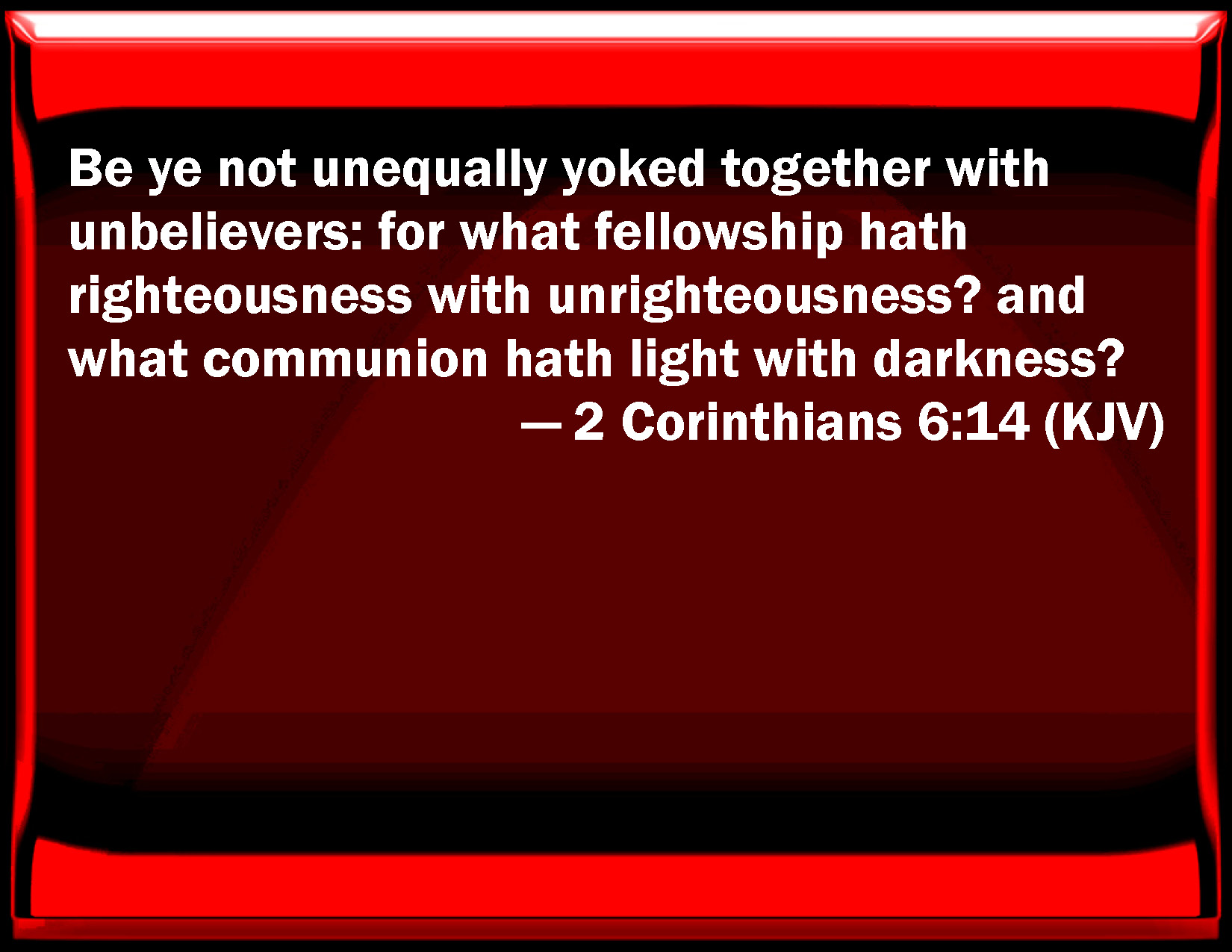 2 Corinthians 6:14 Be you not unequally yoked together with unbelievers: for what fellowship has righteousness with unrighteousness? and what communion has light with darkness?