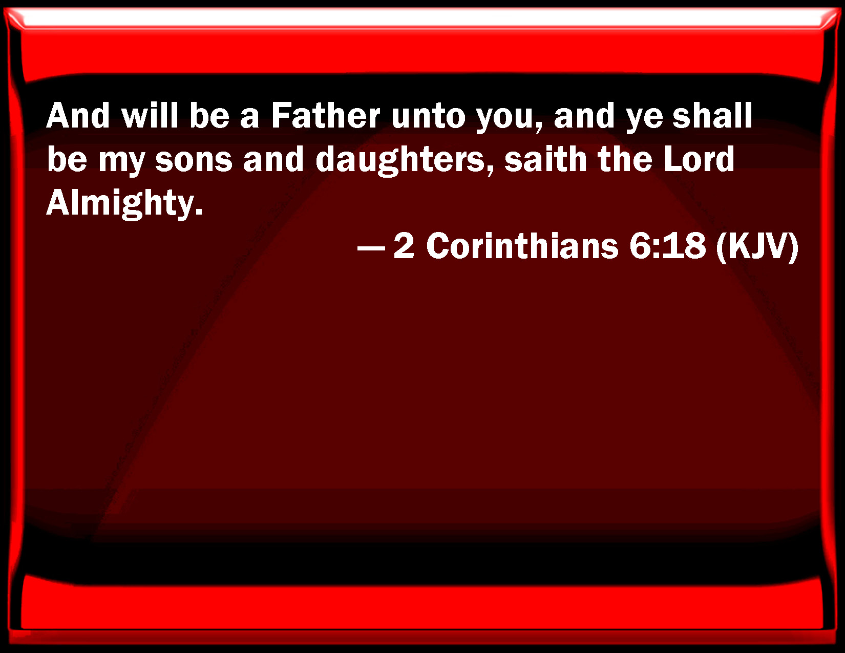 Bible Verse Slide 2 Corinthians 6:18 And will be a Father to you, and you shall be my sons and daughters, said the Lord Almighty. KJV: And will be a Father unto you, and ye shall be my sons and daughters, saith the Lord Almighty. DRB: And I will receive you; and I will be a Father to you; and you shall be my sons and daughters, saith the Lord Almighty. DBT: and I will be to you for a Father, and ye shall be to me for sons and daughters, saith the Lord Almighty. ERV: And will be to you a Father, And ye shall be to me sons and daughters, saith the Lord Almighty. WBT: And I will be a Father to you, and ye shall be my sons and daughters, saith the Lord Almighty. WEB: I will be to you a Father. You will be to me sons and daughters,' says the Lord Almighty." YLT: and I will be to you for a Father, and ye — ye shall be to Me for sons and daughters, saith the Lord Almighty.'Links 2 Corinthians 6:18 NIV • 2 Corinthians 6:18 NLT • 2 Corinthians 6:18 ESV • 2 Corinthians 6:18 NASB • 2 Corinthians 6:18 KJV • 2 Corinthians 6:18 Interlinear • 2 Corinthians 6:18 Commentaries • 2 Corinthians 6:18 Parallel Texts • 2 Corinthians 6:18 Bible Apps • 2 Corinthians 6:18 Parallel • Bible Hub |